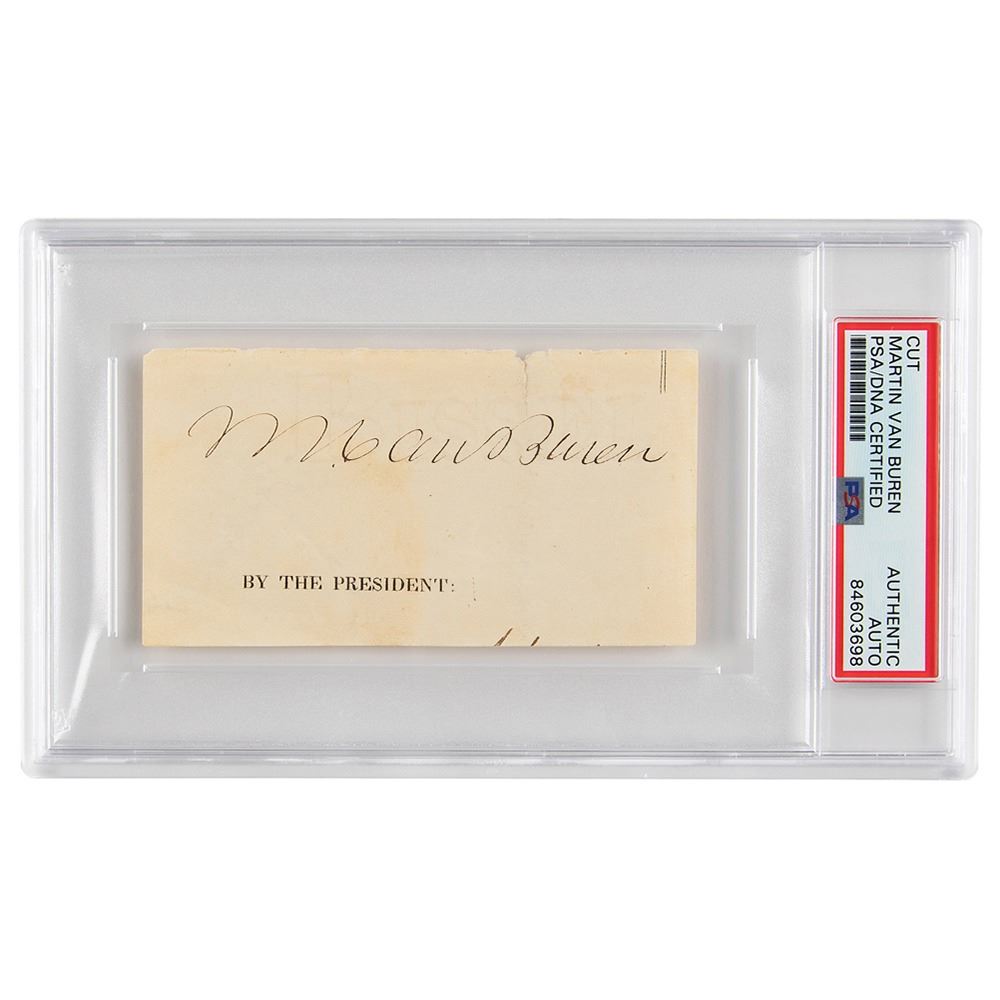 Ink signature as president, "M. Van Buren,†on an off-white 4.25 x 2.25 sheet clipped from a four-language ship's pass. In fine condition. Encapsulated in a PSA/DNA authentication holder.