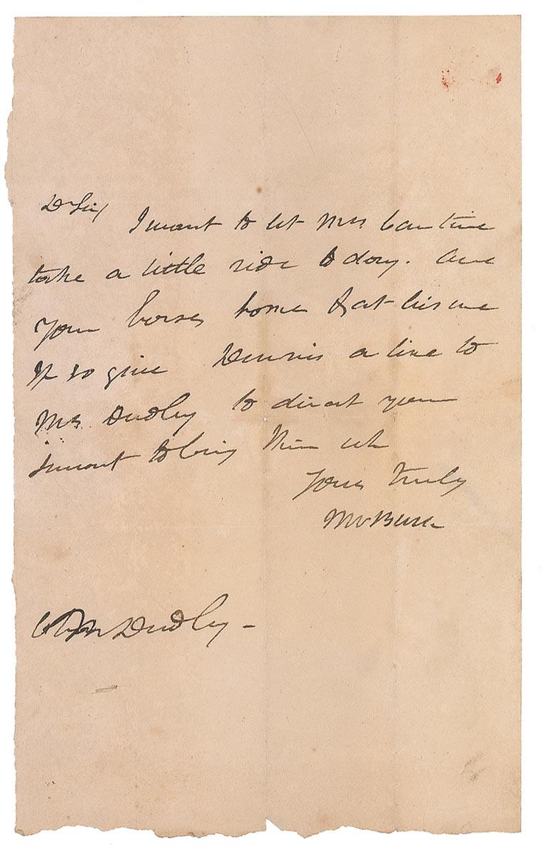 ALS signed “M. V. Buren,” 5 x 7.5, no date [circa 1820s]. Van Buren writes New York Senator Charles Dudley, a fellow member of the Albany Regency, a powerful political organization. In part: “I want to let Mrs. Cantine take a little ride to day [sic]. Leave your horse home and…give Dennis a line to Ms. Dudley to direct your servant to bring this week.” In very good condition, with intersecting folds with two folds affecting his name, wrinkling, and areas of toning. Dudley filled the US Senate seat vacated by Van Buren in 1829, when Van Buren was elected Governor of New York, with the duo becoming regular correspondents. “Mrs. Cantine” was the wife of New York State Senator Moses I. Cantine, Van Buren's brother-in-law.