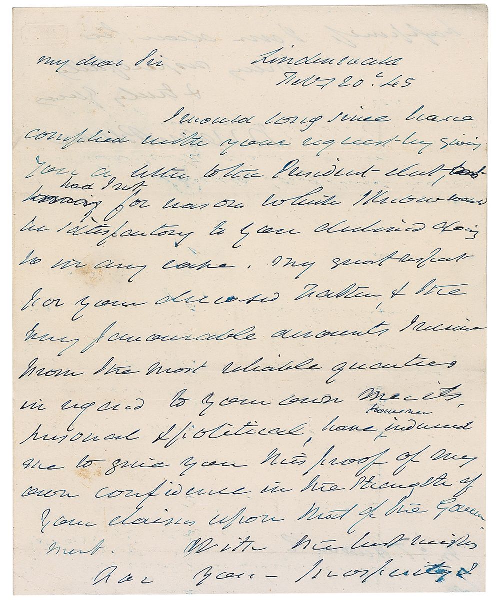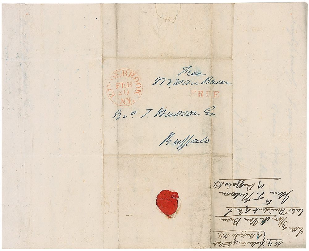 ALS signed “M Van Buren,” one page both sides, 7.75 x 9.75, February 20, 1845. From Kinderhook, Van Buren writes to Mr. Hudson. In part: “I would long since have complied with your request by giving you a letter to the President-elect…my great respect for your deceased Father & the very favorable accounts I receive from the most reliable quarters in regard to your own merits, personal & political, have however induced me to give you this proof of my own confidence in the strength of your claims upon most of the Government.” Reverse of second integral page bears a hand-addressed free franked address panel, addressed by Van Buren to Hudson, and franked at the top of the panel, “Free M. Van Buren.” In very good condition, with intersecting folds, a couple lightly passing through signature, some scattered light soiling and toning, a couple brushes to signature, and small area of paper loss to second page from red wax seal.