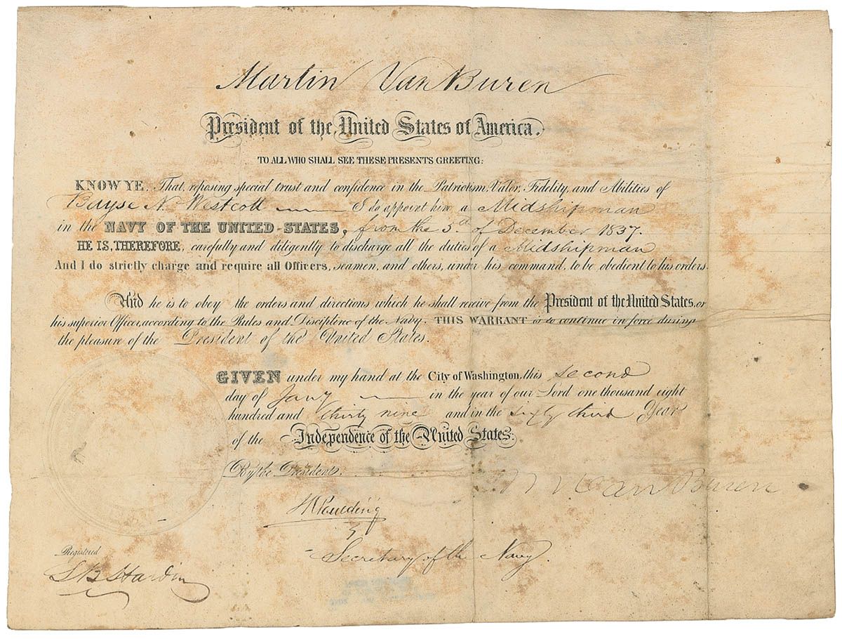 Partly-printed DS as president, signed “M. Van Buren,” one page, 10.25 x 8, January 2, 1839. Van Buren appoints Bayse N. Westcott “a Midshipman in the Navy of the United States.” Signed at the conclusion by Van Buren and countersigned by Secretary of the Navy James Pauling. In good condition, with moderate intersecting folds, a couple lightly affecting signature, scattered toning, soiling, and wrinkling, and Van Buren’s signature a bit light, but still legible. The seal is missing.