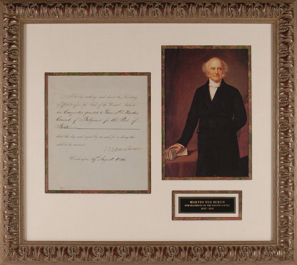 Partly-printed DS as president, signed “M. Van Buren,” one page, 7.25 x 8.5, August 29, 1840. Van Buren orders the secretary of state to “affix the Seal of the United States to an Exequatur granted to Samuel D. Walker Consul of Belgium for the Port of Baltimore.” Nicely double cloth matted and framed with a color portrait and a name plaque to an overall size of 22.5 x 20. A horizontal fold through upper portion of signature, a few creases, and some light staining to left side, otherwise fine condition.