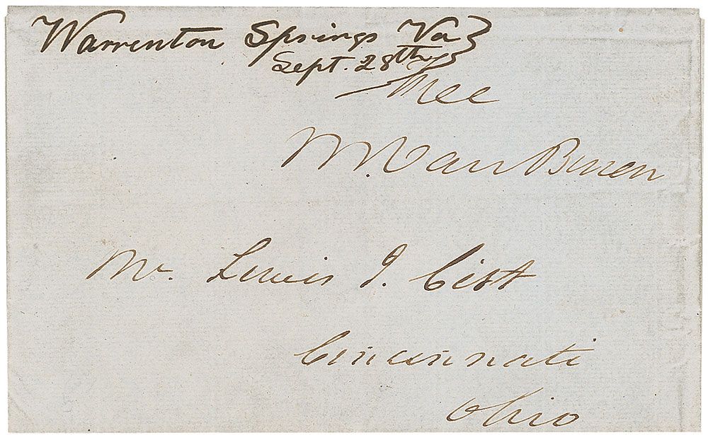 Full hand-addressed free frank, measuring 9.5 x 7.75 unfolded, with panel measuring 5 x 3, addressed by Van Buren to “Mr. Lewis I. Cist, Cincinnati, Ohio,” and franked in the upper right, “Free, M. Van Buren.” Address panel in fine condition, with mounting remnants to upper and lower panels of the full free frank.