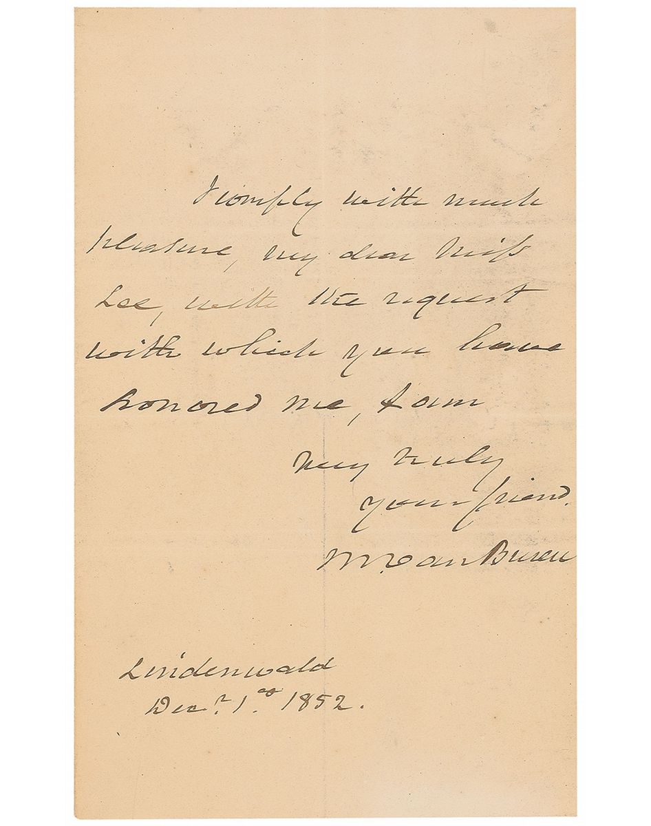 ALS signed “M. Van Buren,” one page, 4.75 x 7.75, December 1, 1852. Letter complying with an autograph request. In full: “I comply with much pleasure, my dear Miss Lee, with the request with which you have honored me.” Intersecting folds, a few creases, and scattered light soiling, otherwise fine condition.