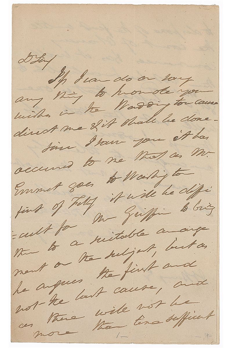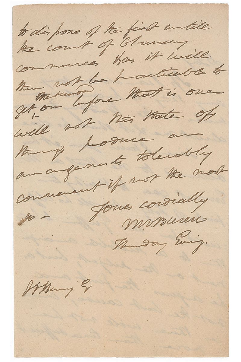 ALS signed “M. V. Buren,” one page both sides, 5 x 8, no date. Letter to John Henry. In part, “Since I saw you it has occurred to me that as Mr. Emmet goes to Washington first of Feby it will be difficult for Mr. Griffin to bring them to an…agreement on the subject, but as he agrees the first and not the last cause, and there will not be more than time sufficient to dispose of the first until the court of Glancey commences.” Intersecting folds, paper loss to integral second page, as well as a docketing notation, otherwise fine condition.