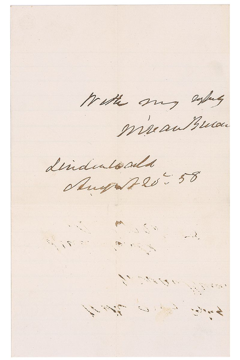 Ink signature, “With my respects, M. Van Buren, Lindenwald, August 20th, 58,” on an off-white 5 x 8 sheet. Central horizontal and vertical folds, and mirroring of ink to lower half of sheet, otherwise fine condition.