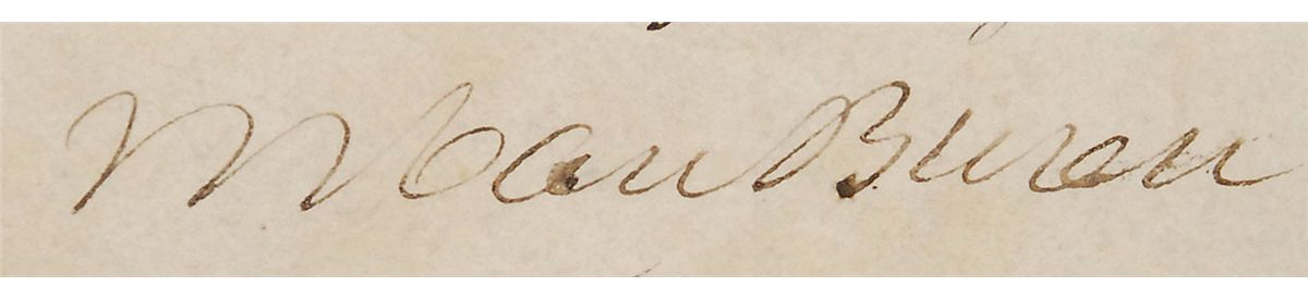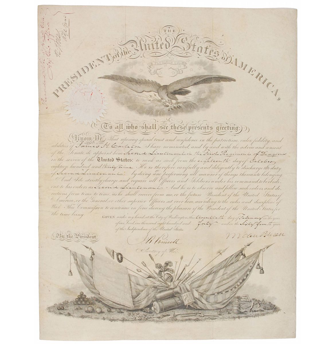 Partly-printed vellum DS as president, signed “M. Van Buren,” one page, 13.75 x 17.75, February 20, 1840. President Van Buren appoints James H. Carleton as “Second Lieutenant in the First Regiment of Dragoons in the service of the United States.” Crisply signed at the conclusion by President Van Buren and countersigned by Secretary of War Joel Roberts Poinsett. The white paper seal affixed to the upper left remains fully intact. In fine condition, with intersecting folds and mild scattered soiling. Poinsett served as US minister to Mexico during John Quincy Adams’s presidency, where he discovered the bright red flowering plant now named for him, the poinsettia, and introduced it to the United States. James H. Carleton was a notable military officer who served through the Civil War, and at this time was with the First Dragoons in the American West, and would participate in an 1844 expedition to the Pawnee and the Oto. He wrote several books about the military and remains best known for his service during the Indian Wars. A very appealing document with a number of interesting associations.