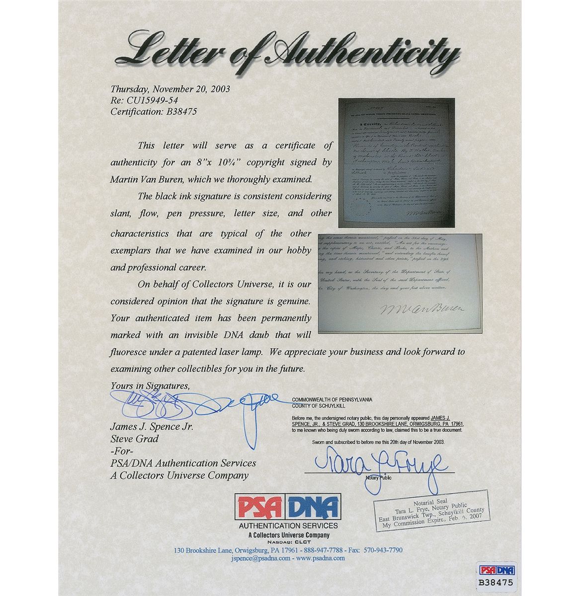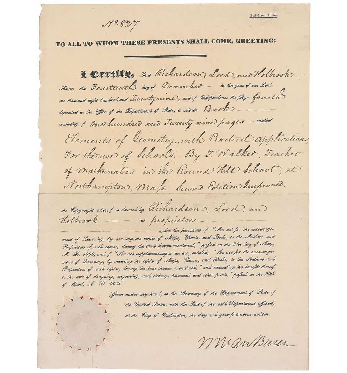 Partly-printed DS as president, signed “M. Van Buren,” one page, 8 x 10.75, December 14, 1829. President Van Buren certifies Richard, Lord, and Holbrook’s copyright of “a certain book consisting of one hundred and twenty nine pages entitled Elements of Geometry, with Practical Applications for the use of Schools. By T. Walker, Teacher of Mathematics in the Round Hill School, at Northampton, Mass. Second Edition Improved.” The crisply embossed white paper seal remains affixed to the lower left. In fine condition, with a rough left edge. Accompanied by a full letter of authenticity from PSA/DNA and an unsigned engraved portrait.