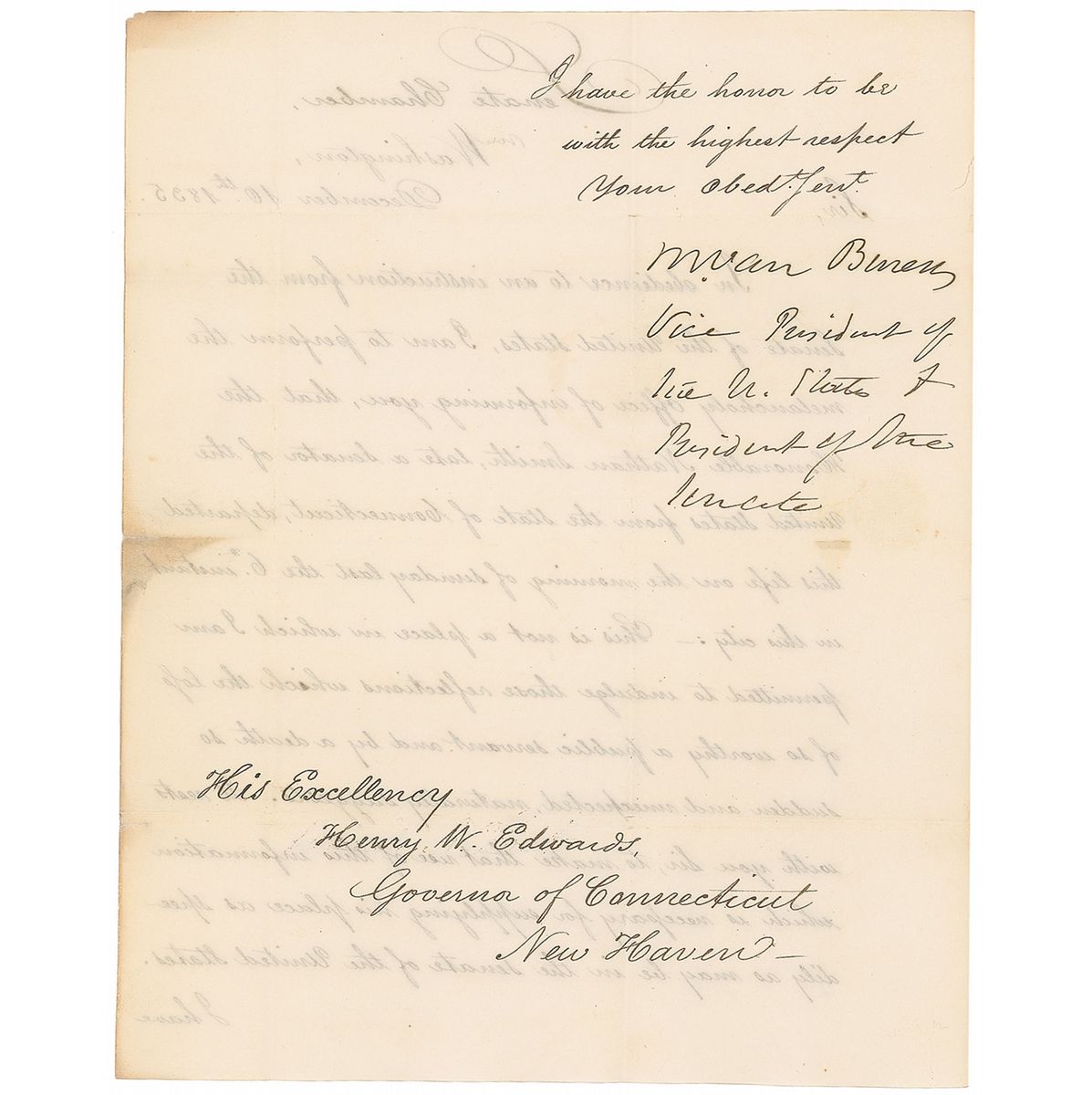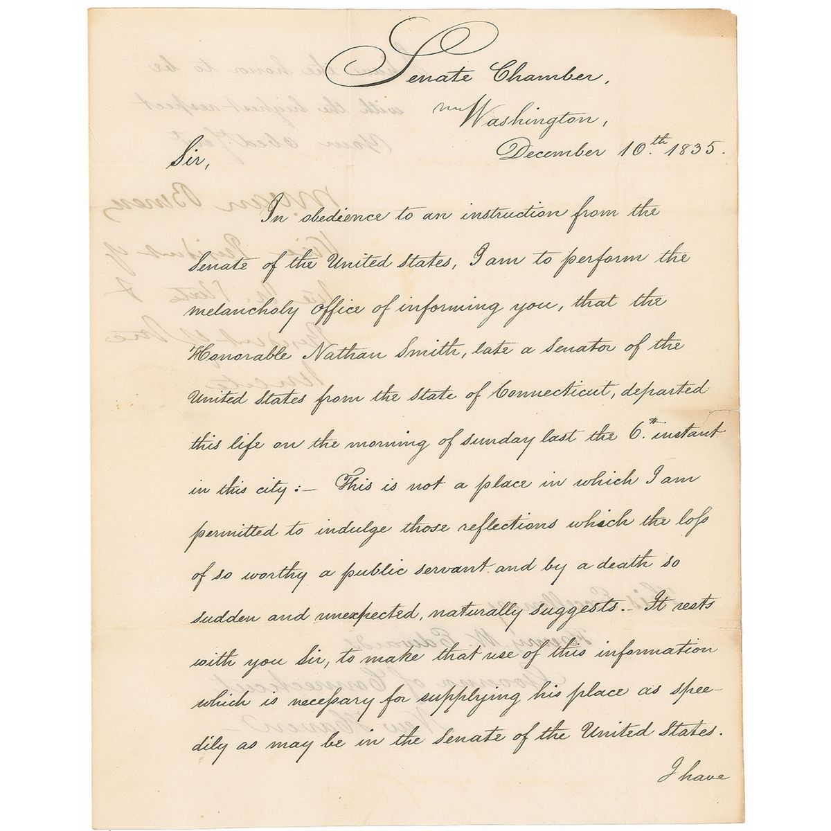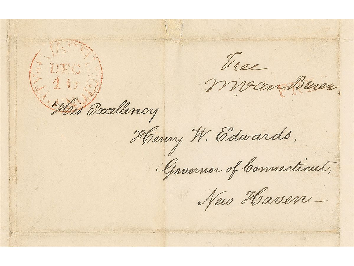 LS signed “M. Van Buren, Vice President of the U. States & President of the Senate,” one page both sides, 8 x 10, December 10, 1835. Letter to Governor Henry W. Edwards of Connecticut. In part: “In obedience to an instruction from the Senate of the United States, I am to perform the melancholy office of informing you, that the Honorable Nathan Smith, late a Senator of the United States from the State of Connecticut, departed this life on the morning of Sunday last…This is not a place in which I am permitted to indulge those reflections which the loss of so worthy a public servant and by a death so sudden and unexpected, naturally suggests. It rests with you Sir, to make that use of this information which is necessary for supplying his place as speedily as may be in the Senate of the United States.” The address panel on the reverse of the second integral page is filled out in another hand and franked in the upper right, “Free, M. Van Buren.” In fine condition, with intersecting folds and partial separation at the top of the adjoining fold. Senator Smith passed away on December 6, 1835, and Governor Edwards appointed Democrat John Milton Niles to fill the vacancy, beginning on December 21. When he wrote this letter, Van Buren was serving as Andrew Jackson’s vice president; he was subsequently elected president and served from 1837 to 1841, and in 1840 appointed John Milton Niles to his cabinet as postmaster general. A politically interesting and well-preserved letter, rarely seen with the free-franked panel still intact.
