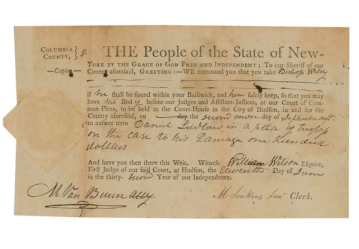 Early partly-printed DS, signed “M. Van Buren, Atty.,” one page, 7.75 x 4.5, June 11, 1808. Court document authorizing the sheriff of Columbia County, New York, to “take Bishop Wilchy if he shall be found within your Bailiwick and him safely keep, so that you may have his Body before our Judges…to answer until Daniel Ludlow in a plea…on the case to his Damages one hundred dollars.” Also signed on the reverse, “M. Van Buren, Atty.” The official seal is intact. Vertical fold passing through his name on the front side, and scattered toning and soiling, otherwise fine condition.
