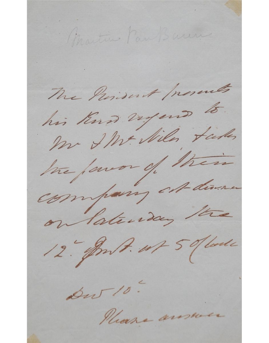 8th President of the U.S. ALS as president. Signed “The President” in the body of the letter. “The President presents his kind regards to Mr. & Mrs. Niles & asks the favor of their company at dinner on Saturday the 12th inst. At 5 o’clock. Dec. 10th. Please answer.” No year given. Very unusual letter.
