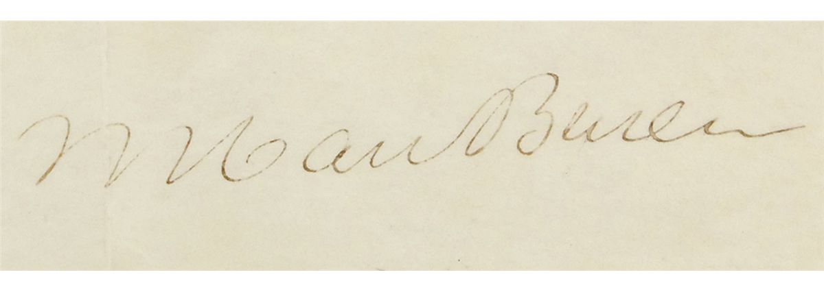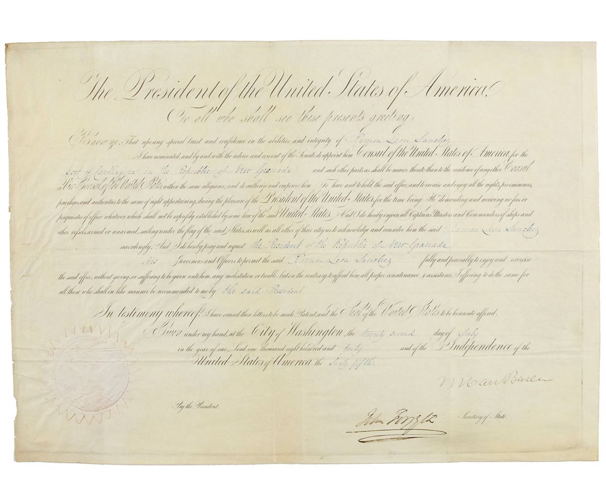 Partly-printed vellum DS as president, signed “M. Van Buren,” one page, 17.5 x 12.5, July 22, 1840. President Van Buren appoints Ramon Leon Sanchez as “Consul of the United States of America for the port of Carthagena in the Republic of New Granada.” Neatly signed at the conclusion by Van Buren and countersigned by Secretary of State John Forsyth. The white paper seal affixed to the lower left remains fully intact, with a couple cracks along folds. In fine condition, with intersecting folds (one vertical fold passing through a single letter of the signature), chipping to left edge, and uniform toning from previous display. A desirable diplomatic appointment.