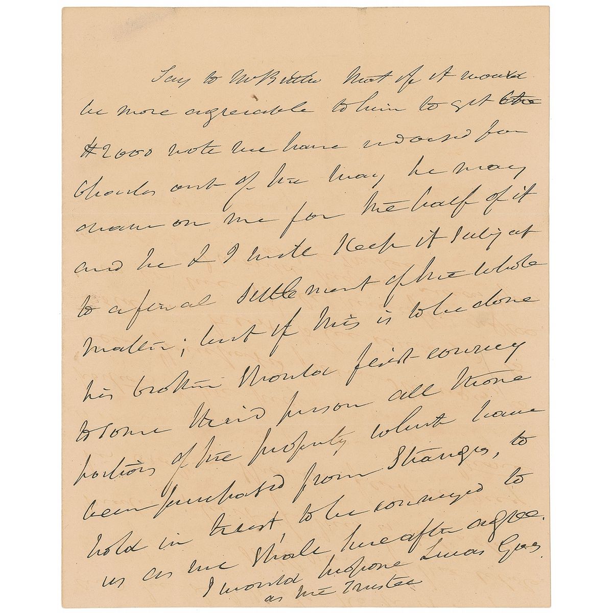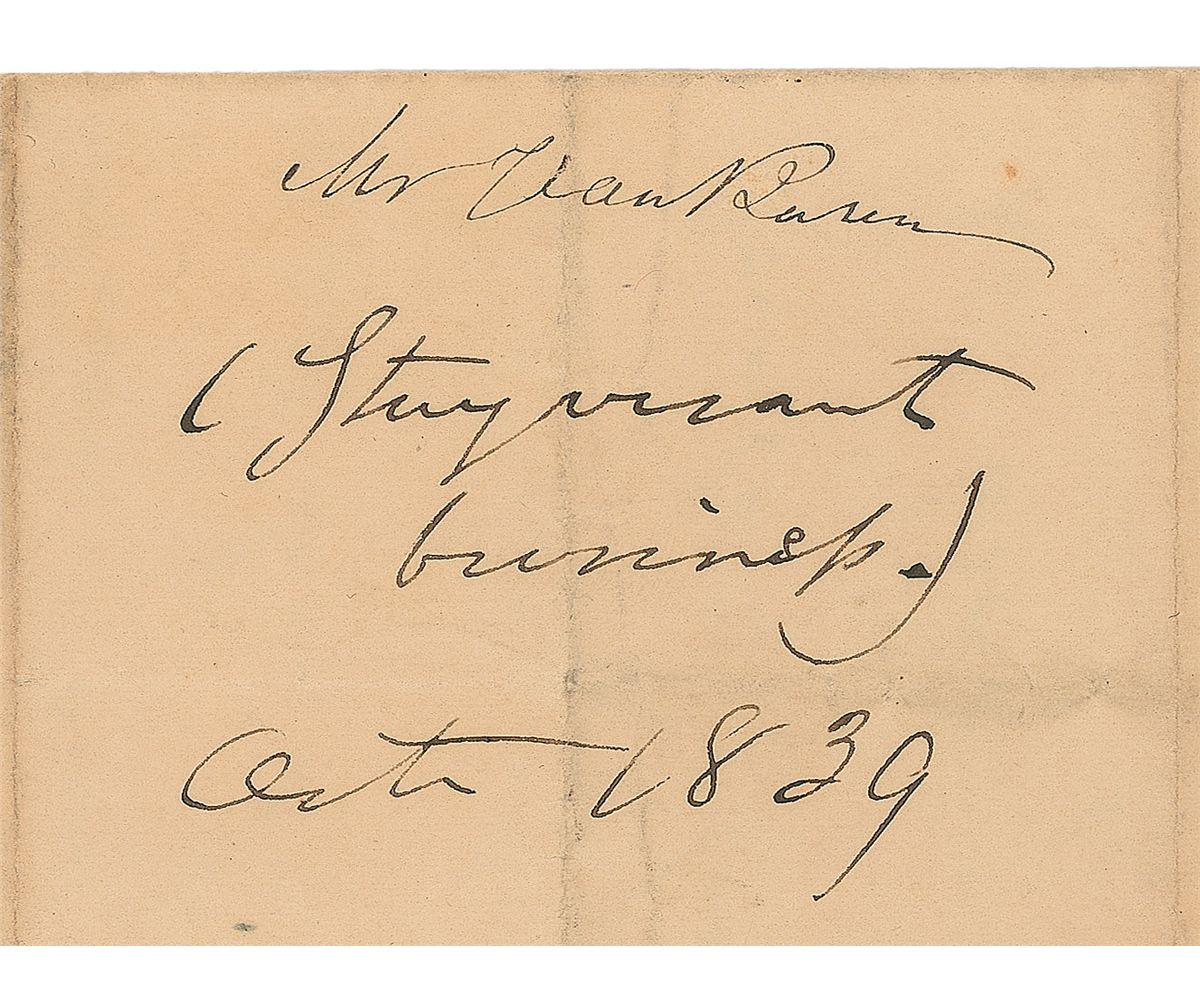 ALS as president, unsigned, one page, 7.25 x 9, no date but circa October 1839. In full: “Say to Mr Butler Most of it would be more agreeable to him to get the $2000 note we have endorsed for Charles out of the way he may draw on me for the half of it and he & I will keep it subject to a final settlement of the whole matter; but if this is to be done his brother should first convey to some third person all those portions of the property which have been purchased from Strangers, to hold in trust, to be conveyed to us as we shall hereafter agree. I would propose Lucas Green as the trustee.” Docketing on the reverse in another hand reads: “M Van Buren, (Stuyvesant business), Oct 1839.” In fine condition, with intersecting folds.