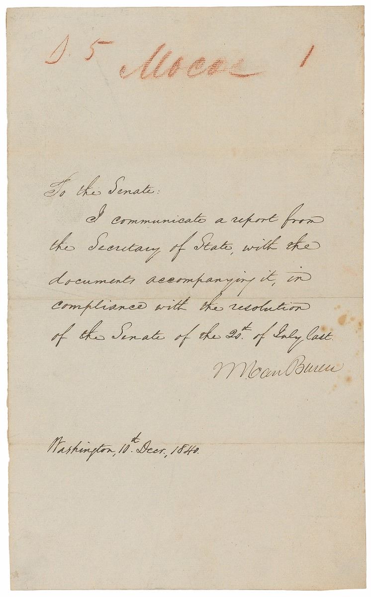 LS as president signed “M. Van Buren,” one page, 8 x 13, December 10, 1840. A letter submitted “To the Senate.” In full: “I communicate a report from the Secretary of State, with the documents accompanying it, in compliance with the resolution of the Senate of the 20th of July last.” Foxing to the right of the signature and large pencil notations at the top, otherwise fine condition.