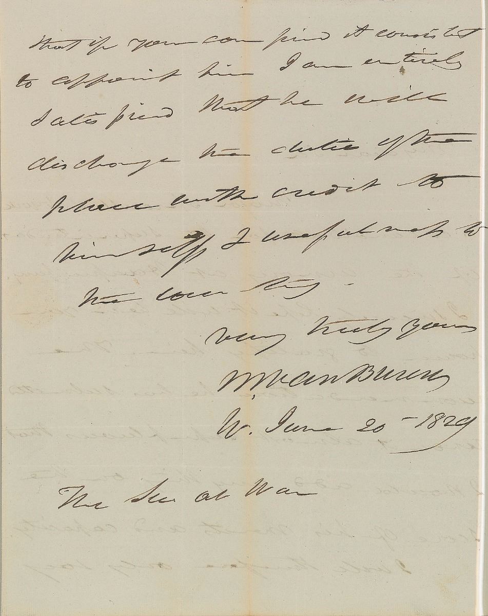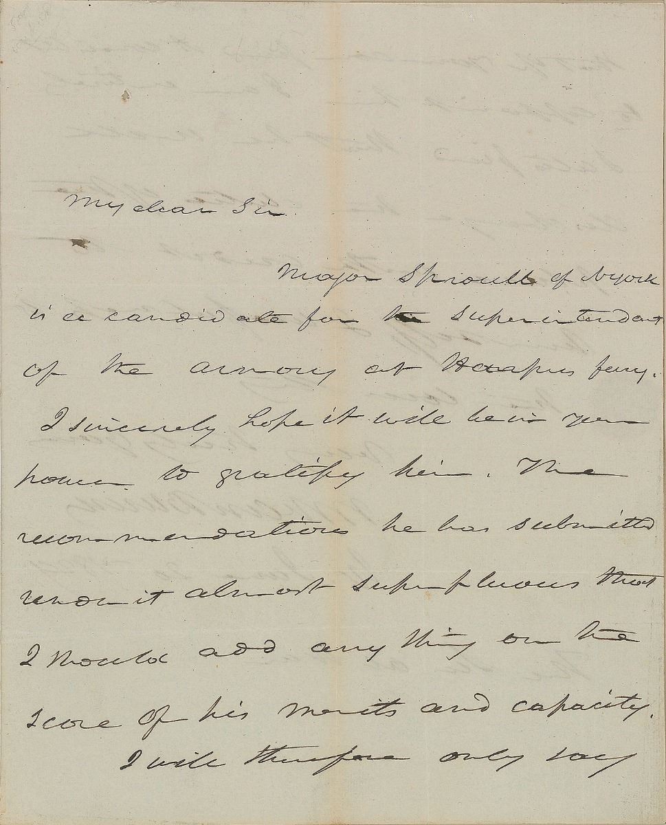 ALS signed “M. Van Buren,” one page both sides, 7.75 x 9.75, June 20, 1829. Letter to the secretary of war. In part: “Major Sproult of N. York is a candidate for the superintendent of the armory at Harpers ferry. I sincerely hope it will be in your power to gratify him. The recommendations he has submitted render it almost superfluous that I should add anything on the score of his merits and capacity. I will therefore only say that if you can find it consistent to appoint him I am entirely satisfied he will discharge the duties of the place with credit to kinship & usefulness.” Removably encapsulated in a mylar sleeve. In fine condition.
