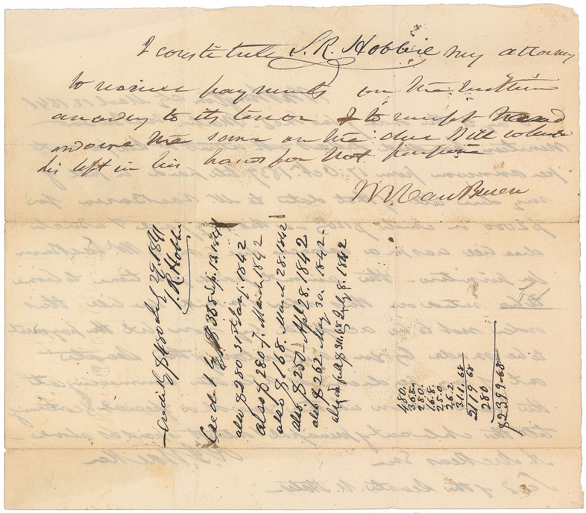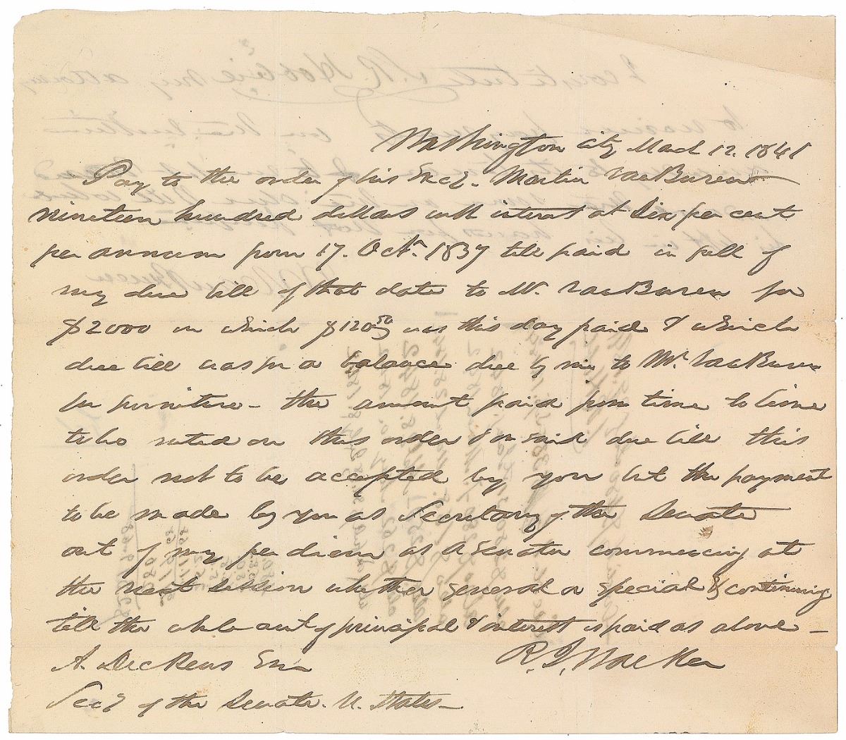 Autograph endorsement signed “M. Van Buren,” on the reverse of a manuscript document, one page, 8 x 7, March 12, 1841. Van Buren writes, in part: “I constitute…my attorney to receive payments…according to its tenor…and owe the same on the due Bill…left in his hands for that purpose.” The document on the opposite side, signed by Senator Robert J. Walker, in part: “Pay to the order of his Excy. Martin Van Buren nineteen hundred dollars with interest…for a balance due by me to Mr. Van Buren for furniture…the payment to be made by you as Secretary of the Senate out of my per diem as a Senator.” In fine condition, with a small split along one of the intersecting folds. Van Buren had left the White House just a week before the March 12th date of this document.