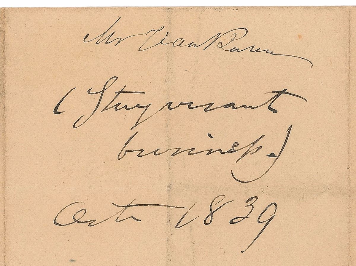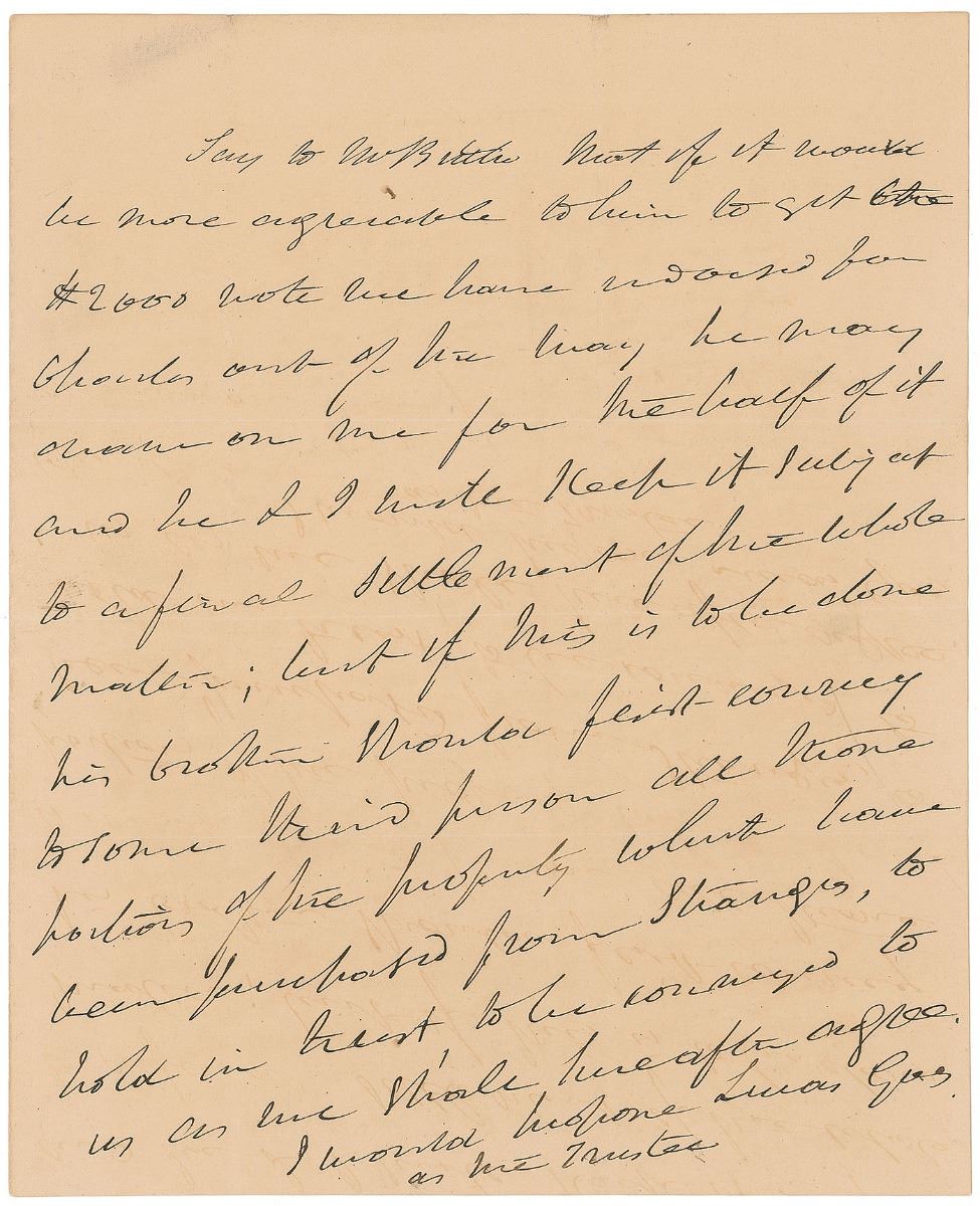 ALS as president, unsigned, one page, 7.25 x 9, no date but circa October 1839. In full: “Say to Mr Butler Most of it would be more agreeable to him to get the $2000 note we have endorsed for Charles out of the way he may draw on me for the half of it and he & I will keep it subject to a final settlement of the whole matter; but if this is to be done his brother should first convey to some third person all those portions of the property which have been purchased from Strangers, to hold in trust, to be conveyed to us as we shall hereafter agree. I would propose Lucas Green as the trustee.” Docketing on the reverse in another hand reads: “M Van Buren, (Stuyvesant business), Oct 1839.” In fine condition.