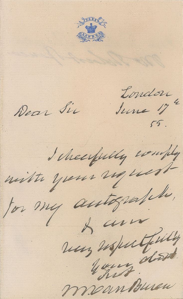 ALS signed “M. Van Buren,” one page, 4.25 x 7, Long’s Hotel letterhead, June 17, 1855. Written from London, a courtesy letter to Robert Spence, in full: “I cheerfully comply with your request for my autograph.” Van Buren has penned the recipient’s name twice on the succeeding integral pages. In fine condition.
