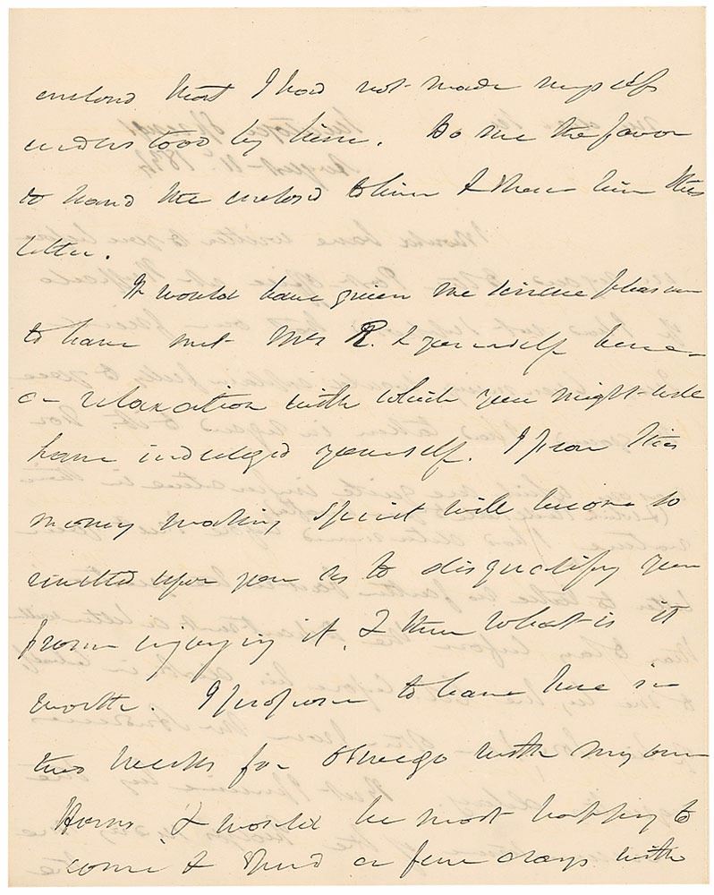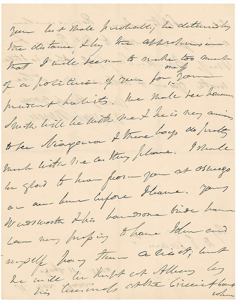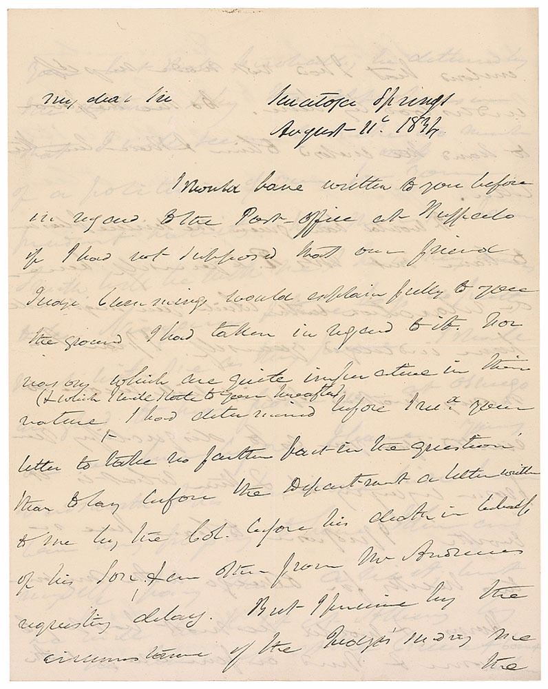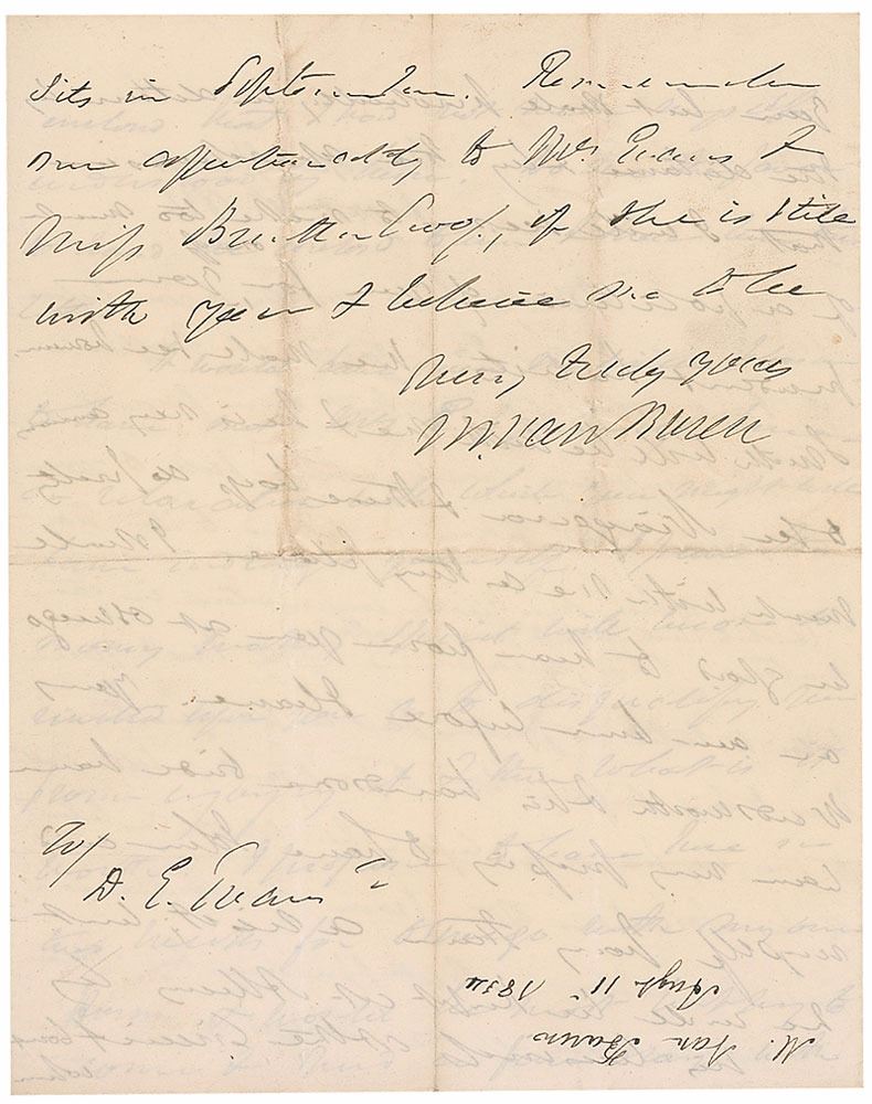ALS signed “M. Van Buren,” four pages on two adjoining sheets, 8 x 10, August 11, 1834. Lengthy letter to former Congressman David Evans. In part: “I should have written to you before in regard to the Post-Office at Buffalo if I had not supposed that our friend Judge Cummings would explain fully to you the ground I had taken…I had determined before I recd your letter to take no farther part in the question…But I perceive by the circumstance of the Judge’s sending me the enclosed that I had not made myself understood by him. Do me the favor to hand the enclosed to him and show him this letter…It would have given me sincere pleasure to have met Mr. R & yourself here—a relaxation with which you might well have indulged yourself. I fear this money making spirit will…disqualify you from enjoying it. I propose to leave here in two weeks for Oswego with my own horses. I would be most happy to come & spend a few days with you but shall probably be deterred by the distance & by the apprehension that I will be seen to make too much of a politician of you for one of your prudent habits…Smith will be with me & he is very anxious to see Niagara & these boys do pretty much with me as they please…Young Wadsworth and his handsome bride have been very pressing to have John and myself pay them a visit, but he will be kept at Albany by his business at the Circuit Court.” In fine condition.