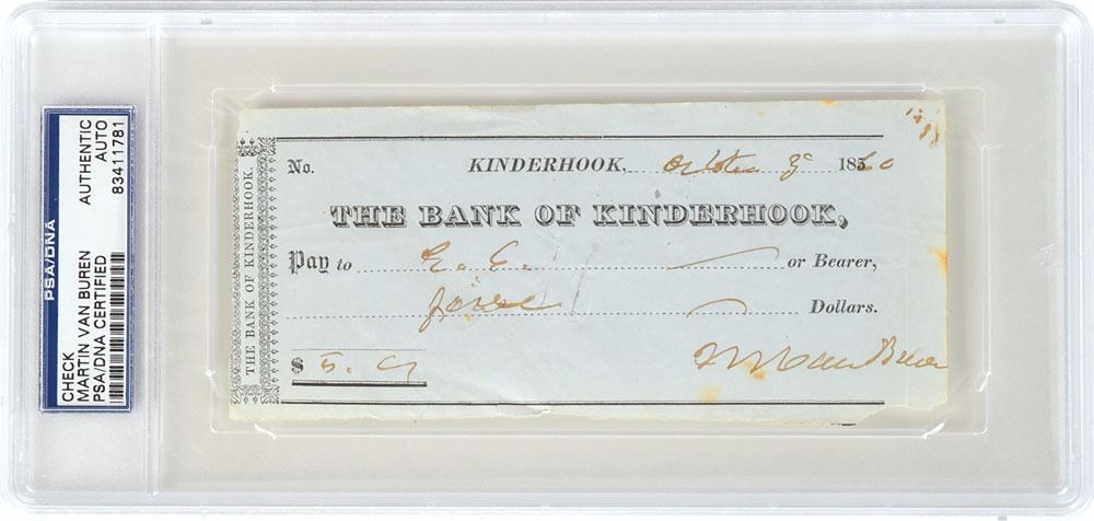 Bank of Kinderhook check, 6.25 x 2.75, filled out and signed by Van Buren, "M. Van Buren," payable to E. C. for $5, October 3, 1860. Encapsulated in a plastic PSA/DNA authentication holder. In fine condition, with light paper loss along the lower edge. Van Buren's estate, known as Lindenwald, was located two miles south of the village of Kinderhook, New York. A scarce format, this is just the fourth Van Buren check we have offered.