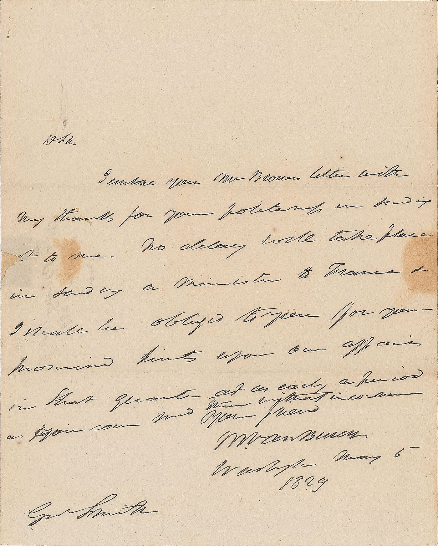 ALS as secretary of state, signed "M. Van Buren," one page, 7.75 x 9.75, May 5, 1829. Letter to General Samuel Smith, in part: "I enclose you Mr. Brown's letter with my thanks for your politeness in sending it to me. No delay will take place in sending a minister to France & I shall be obliged to you for your promised hints upon our affairs in that quarter." In fine condition, with two light semicircular stains and a repaired area of paper loss to the left edge. During this time, Van Buren was serving as secretary of state in the Jackson administration; one of his notable successes in this capacity was settling long-standing claims against France and winning reparations for property that had been seized during the Napoleonic Wars.