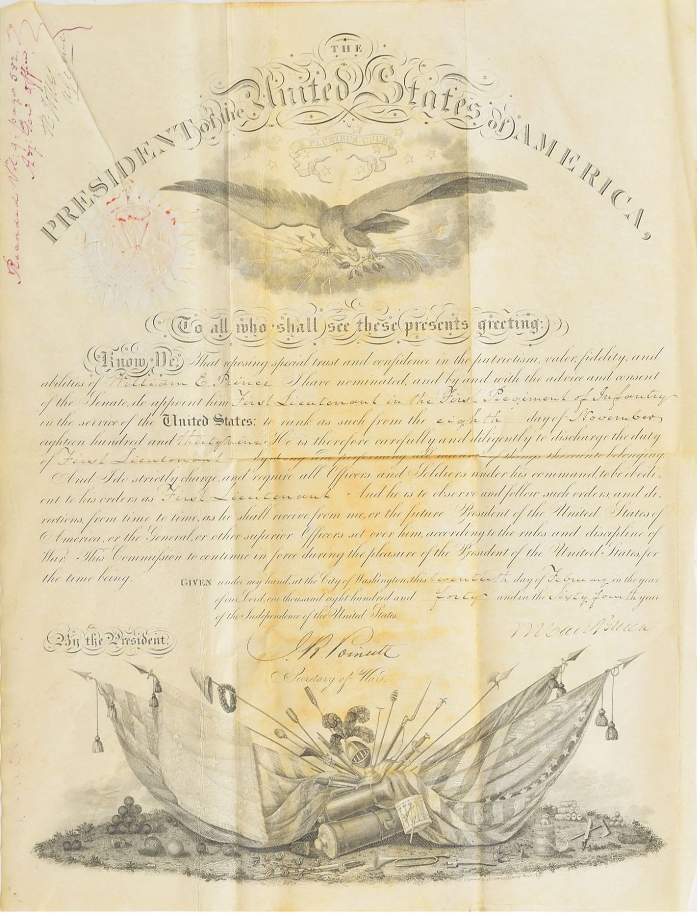 Partly-printed vellum DS as president, signed “M. Van Buren,” one page, 13.75 x 16.75, February 20, 1840. President Van Buren appoints William E. Prince as "First Lieutenant in the First Regiment of Infantry in the service of the United States." Signed at the conclusion by Van Buren, and countersigned by Secretary of War Joel R. Poinsett. White paper seal remains affixed to upper left panel. In very good condition, with heavy intersecting folds, and areas of light toning. Accompanied by another appointment for Prince, which bears a stamped signature of Andrew Johnson.