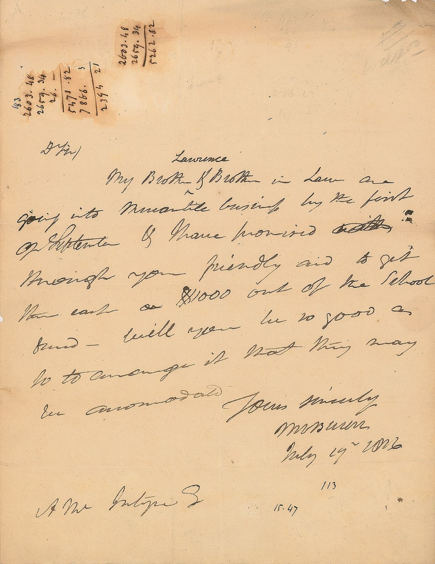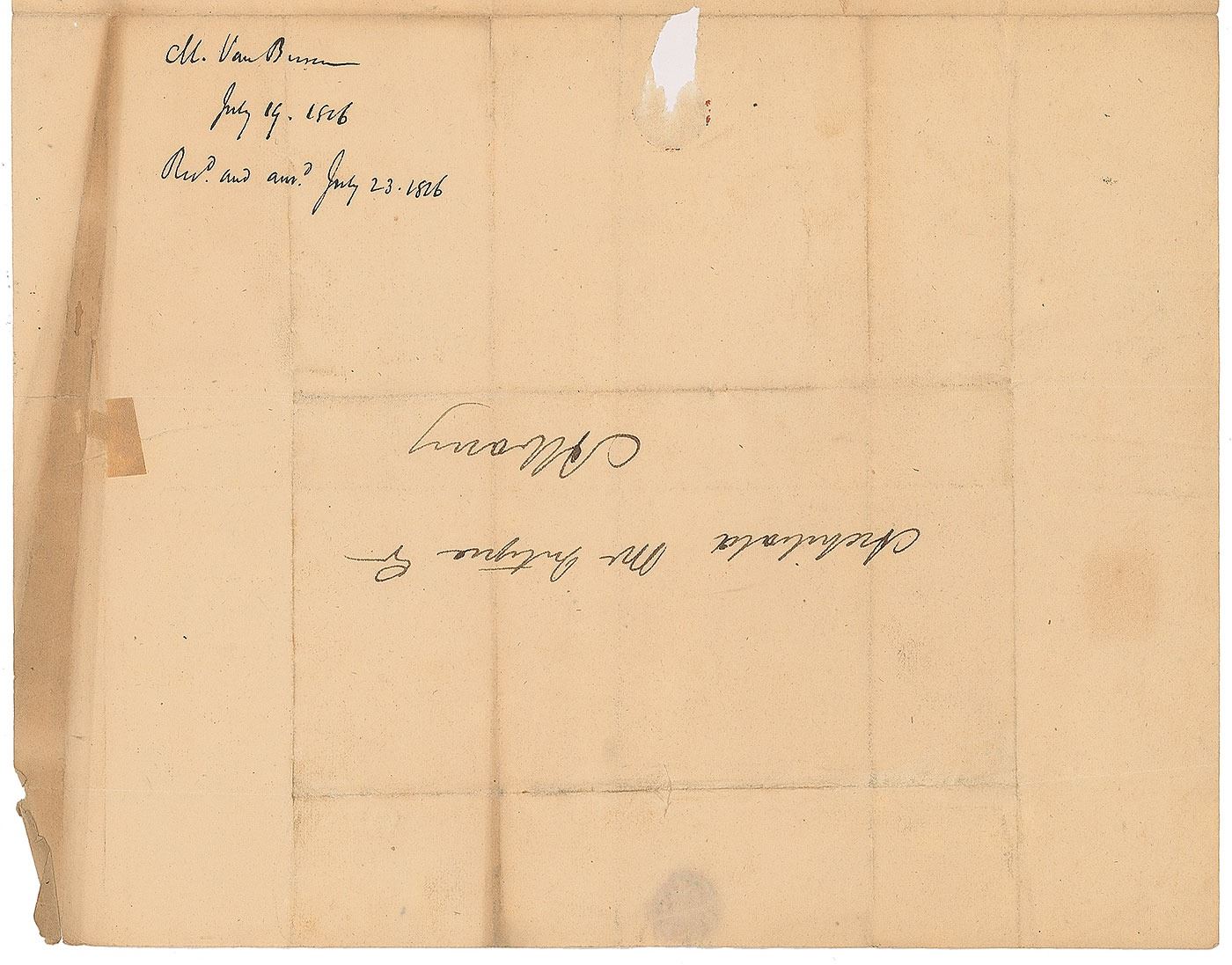 ALS signed “M. V. Buren,” one page, 8 x 10.25, July 19, 1816. Letter to New York merchant and politician Archibald McIntyre, in part: "My Brother Lawrence & Brother in Law are going into Mercantile business by the first of September & I have promised through your friendly aid to get them cash or $1000 out of the School fund. Will you be so good as to arrange it that they may be accommodated." Addressed on the reverse of the second integral sheet in Van Buren's hand. In very good to fine condition, with creasing to the top, several intersecting folds, and arithmetic penned in another hand. Written at 34 years old, this is one of the earliest letters by Van Buren we have offered.