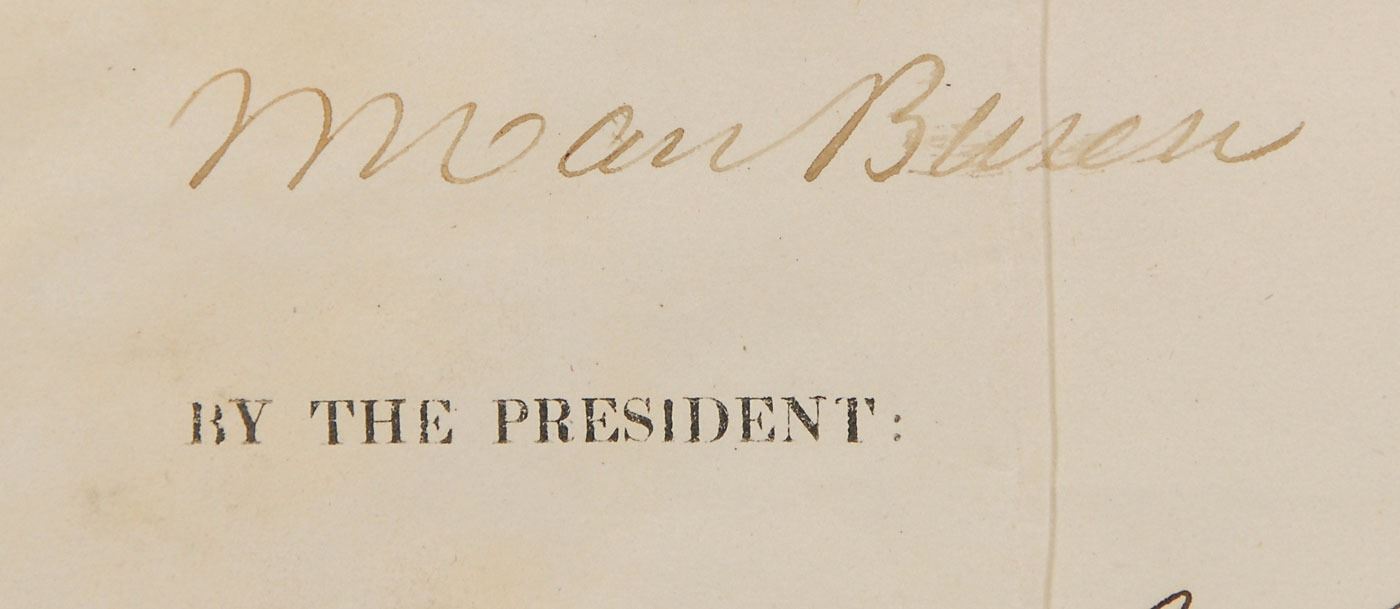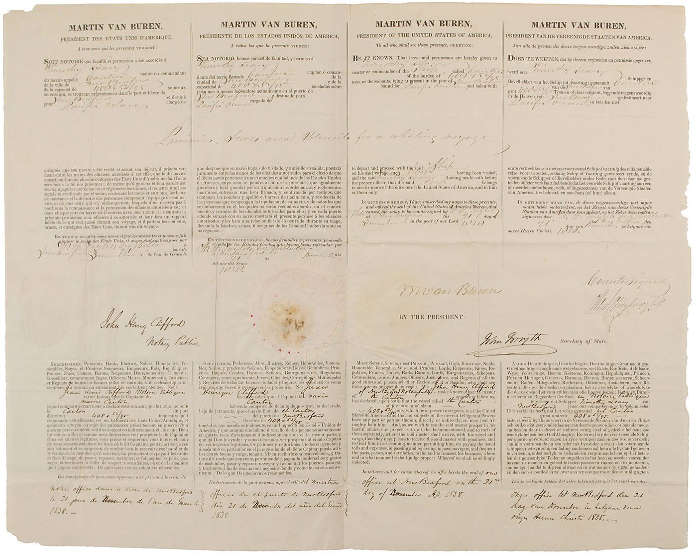 Partly-printed DS as president, signed "M. Van Buren," one page, 20.25 x 16, November 21, 1838. Four-language ship's papers issued to "Timothy Leary, master or commander of the Ship called Canton...lying at present in the port of New Bedford bound for the Pacific Ocean and laden with Provisions, Stores and Utensils for a whaling voyage." Neatly signed at the conclusion by President Van Buren and boldly countersigned by Secretary of State John Forsyth. The white paper seal affixed to the center remains fully intact with significant soiling. In very good condition, with intersecting folds (one vertical fold passing through a single letter of the signature), partial separations to folds repaired on the reverse, and small but noticeable areas of paper loss to edges.