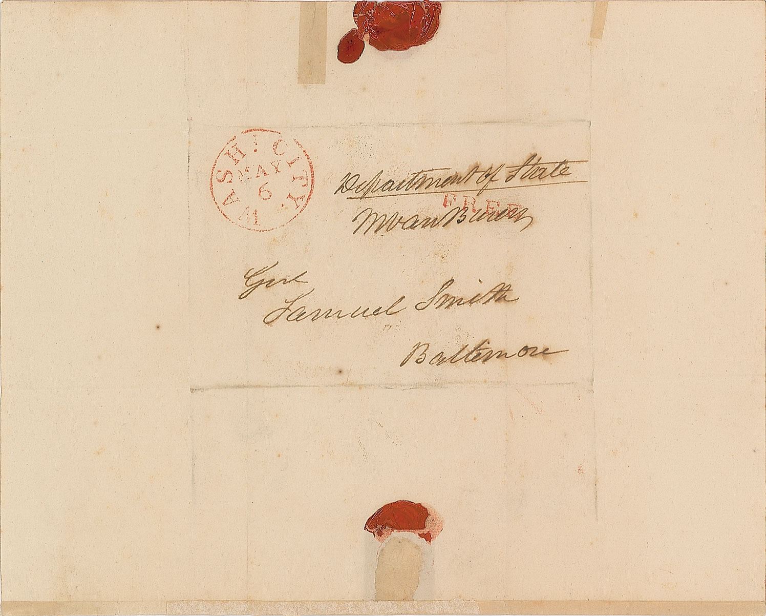Full free frank, measuring 9.75 x 8 with a center panel of 5.25 x 3.25, postmarked May 6 [circa 1829–31], addressed by Van Buren to "Genl. Samuel Smith, Baltimore," and franked in the upper right, "Department of State, M. Van Buren." Stamped "Free" below the signature. In fine condition, with edge repairs to seal-related paper loss.
