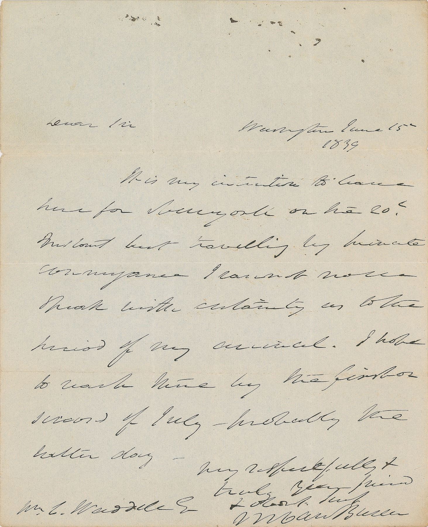 ALS as president signed “M. Van Buren,” one page, 8 x 9.75, June 15, 1839. Letter to William C. Waddell, in full: "It is my intention to leave here for New York on the 20th Instant but travelling by private conveyance I cannot now speak with certainty as to the period of my arrival. I hope to reach there by the first or second of July—probably the latter day." In fine condition, with scattered creasing and several intersecting folds.