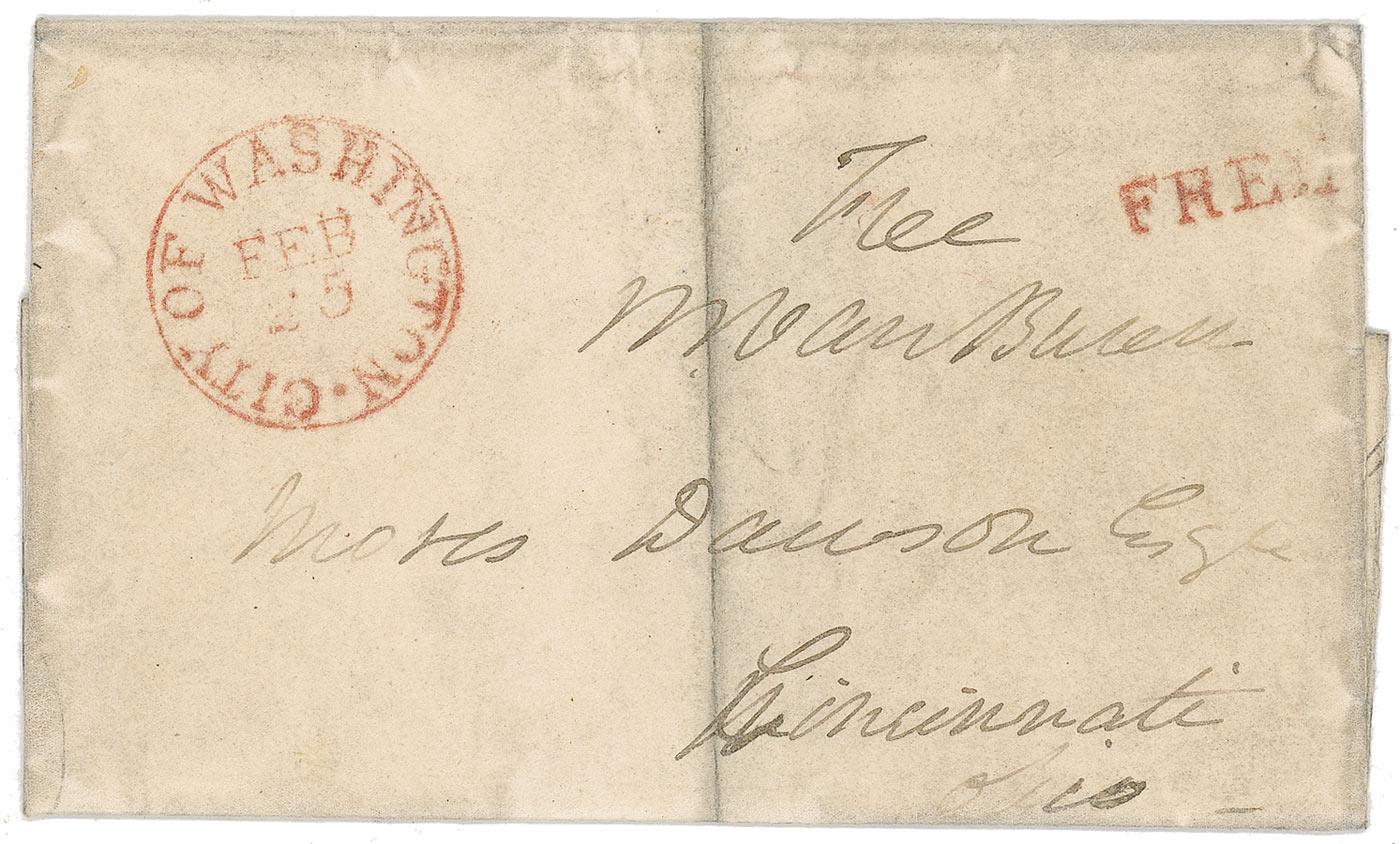 Complete hand-addressed free frank, 5.75 x 3.5, which unfolds to 10 x 8, addressed in Van Buren’s hand to “Moses Dawson, Esq., Cincinnati, Ohio,” and franked above the address, “Free, M. Van Buren.” Panel also bears a February 15, Washington postmark as well as a “Free” stamp. Frank has been professionally silked on both sides. In very good condition, with central vertical fold to panel, light overall soiling, paper loss to bottom portion from seal, and aforementioned silking. Pre-certified John Reznikoff/PSA/DNA and RRAuction COA.