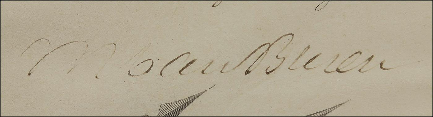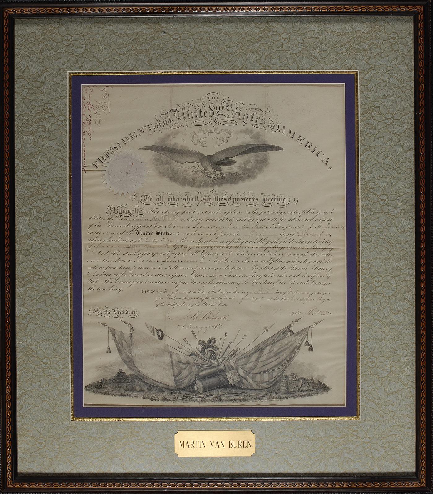 Partly-printed DS as president, signed “M. Van Buren,” one page, 13 x 16, February 20, 1840. President Van Buren appoints Benjamin H. Arthur to the position of “Second Lieutenant in the First Regiment of Infantry in the service of the United States.” Signed at the conclusion by Van Buren, and countersigned by Secretary of War Joel R. Poinsett (for whom the popular Christmas flower was named). Triple matted and framed to an overall size of 21.5 x 24.5. In very good condition, with intersecting folds, light rippling, lightly affecting signature, Van Buren’s first initial a couple shades light, and a uniform shade of mild toning. The white seal is intact and fairly crisp. Oversized. Pre-certified John Reznikoff/PSA/DNA and RRAuction COA.