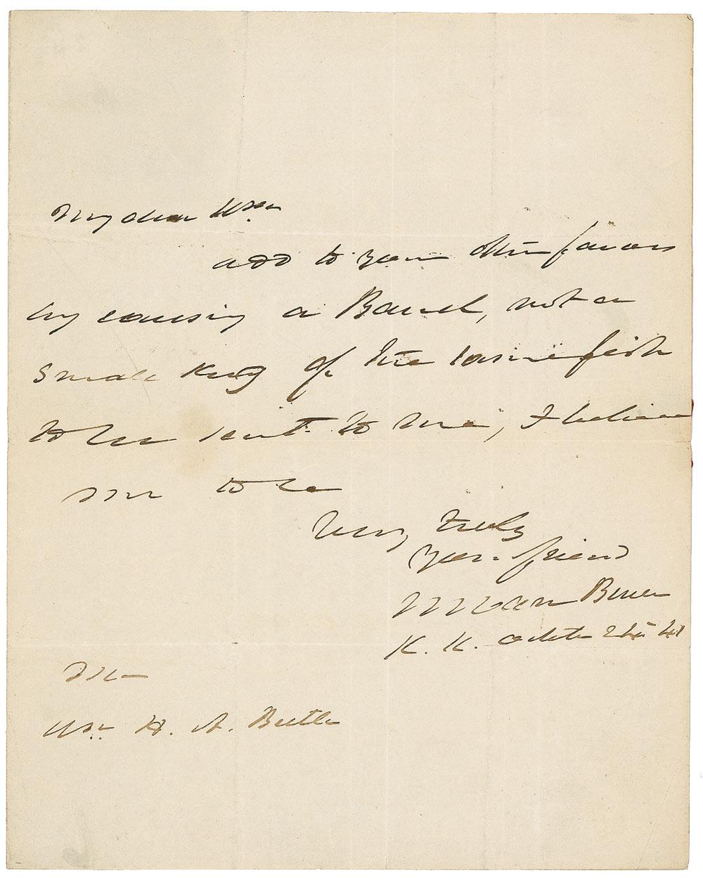 ALS signed “M. Van Buren,” one page, 8 x 10, October 24, 1841. Letter to William H. A. Butler. In full: “Add to your other favors by causing a Barrel, not a small keg of the same fish to be sent to me.” Second integral panel bears an address panel in another hand. In very good condition, with intersecting folds, one through a single letter of signature, scattered creases and wrinkles, a few spots of light toning.