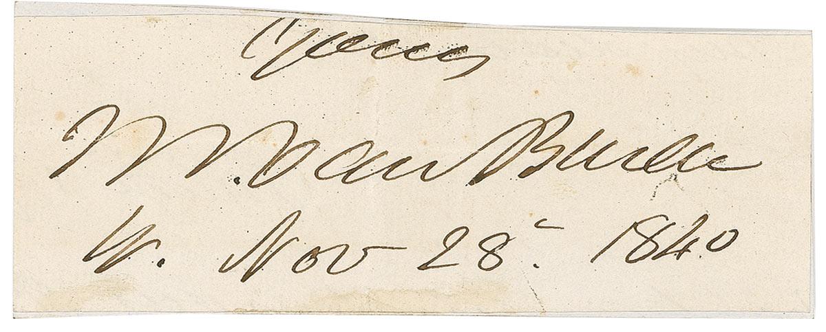 Ink signature, “Yours, M. Van Buren, W[ashington], Nov. 28, 1840,” on an off-white 4 x 1.5 clipped slip affixed to an identical size slip. In very good condition, with central vertical and horizontal fold, with horizontal fold through signature, and some scattered toning and foxing. Accompanied by an unsigned engraved portrait.