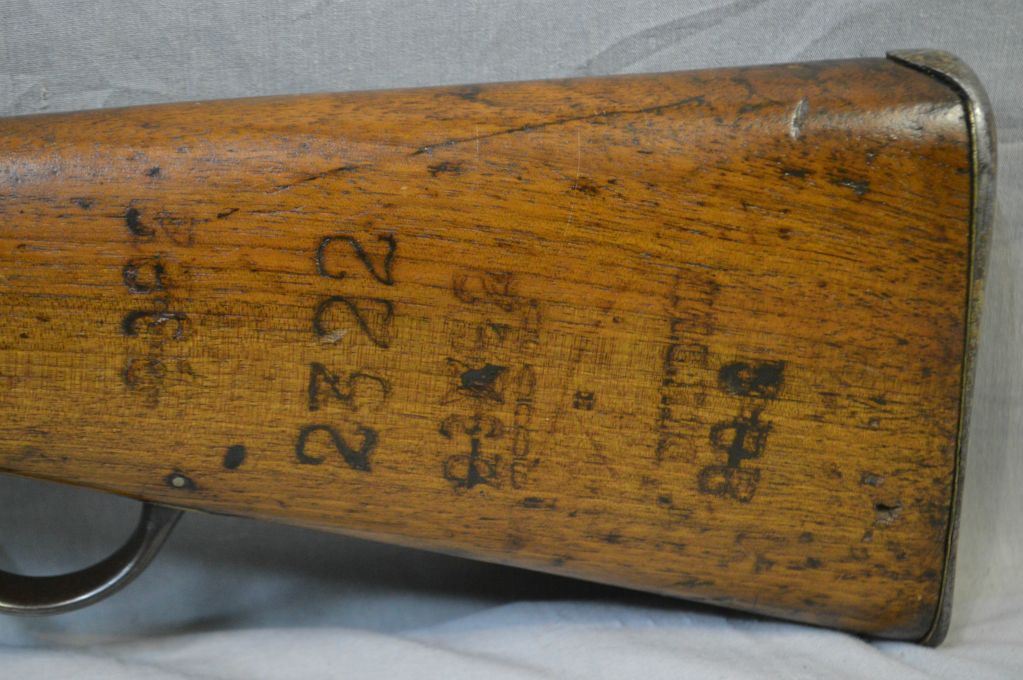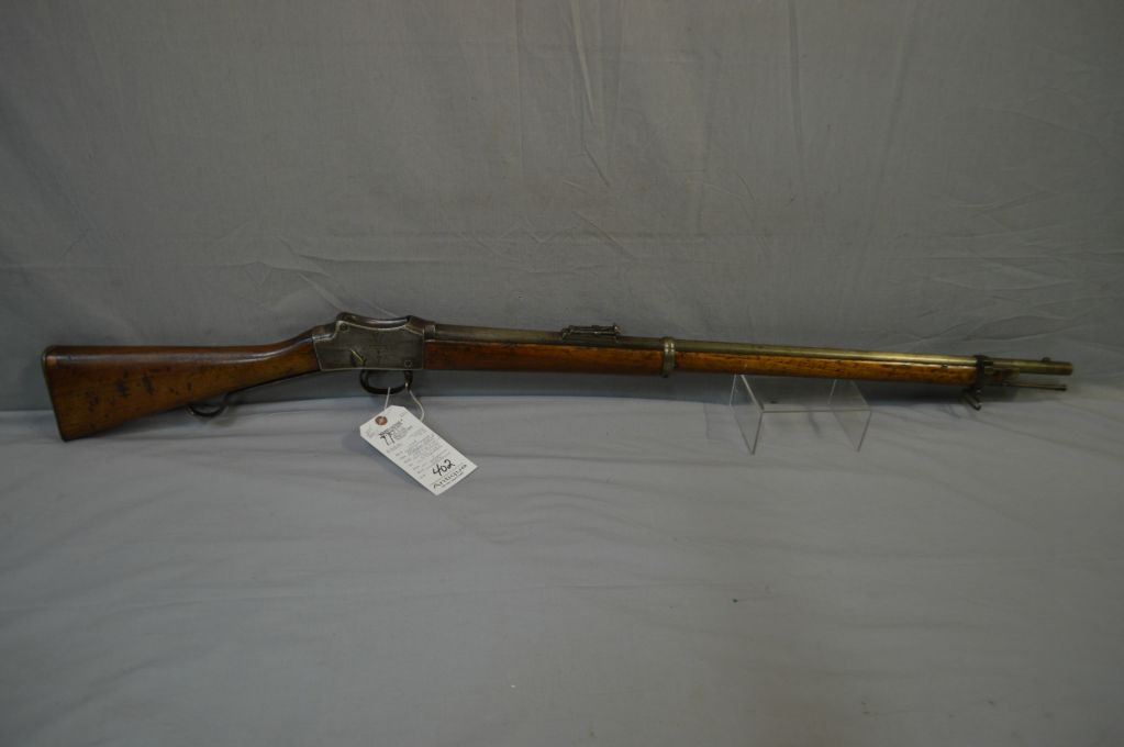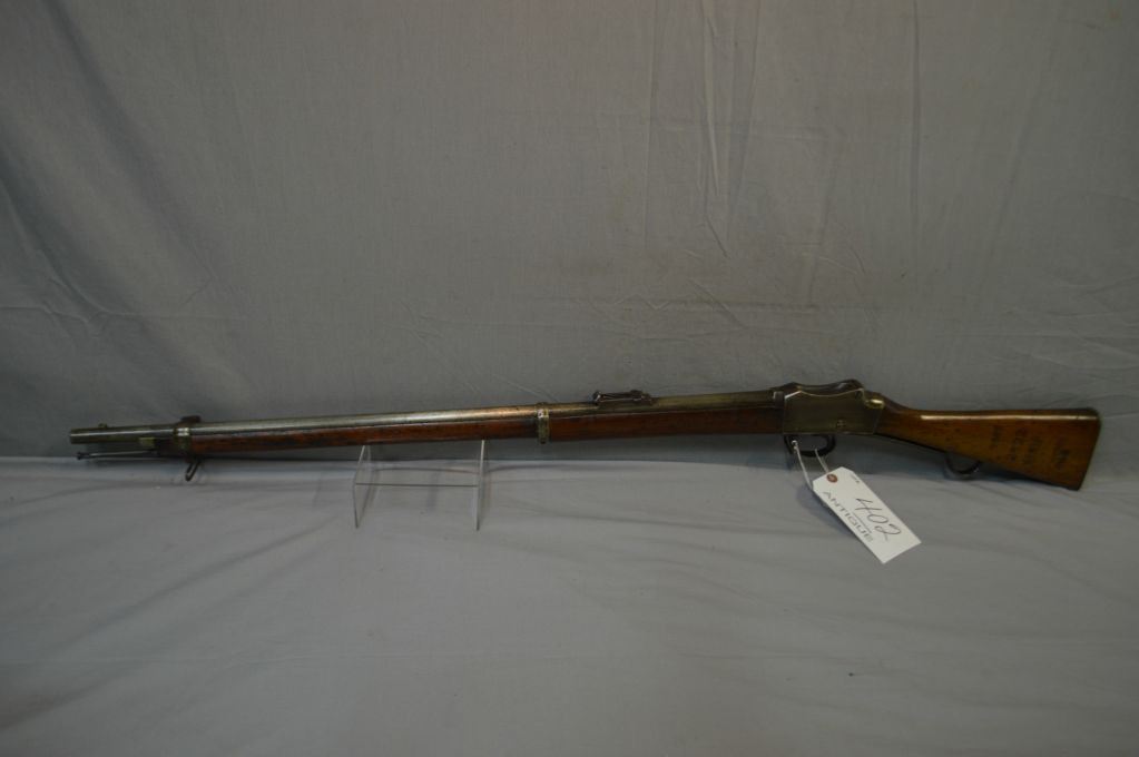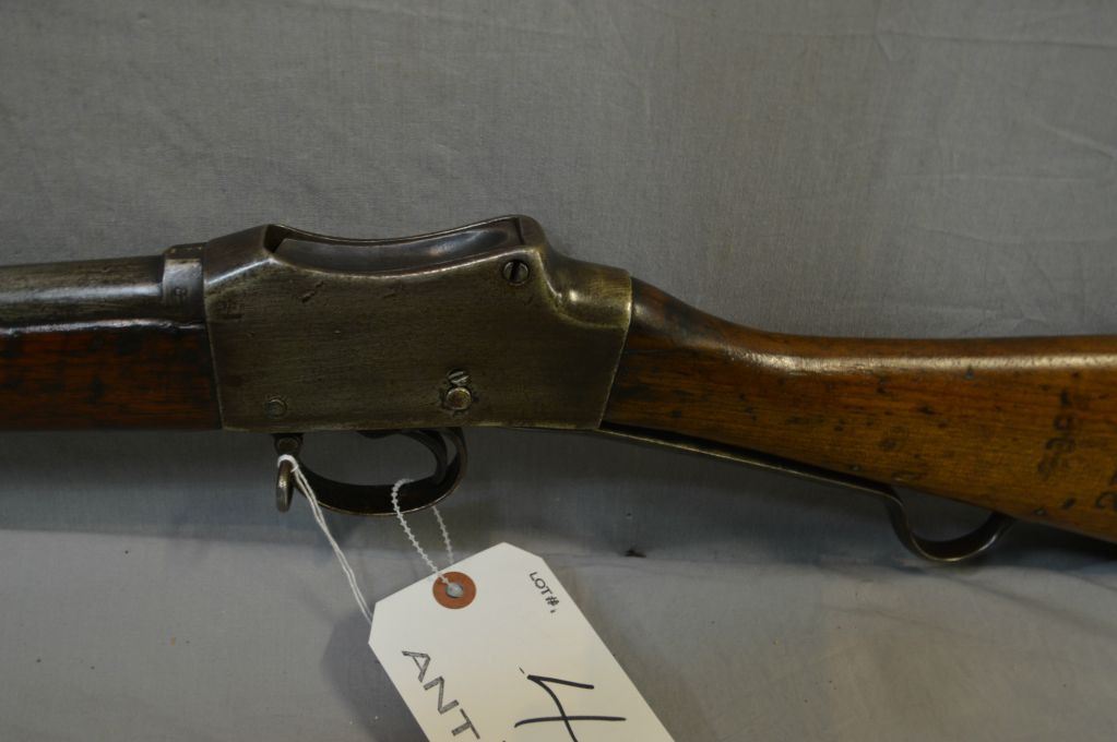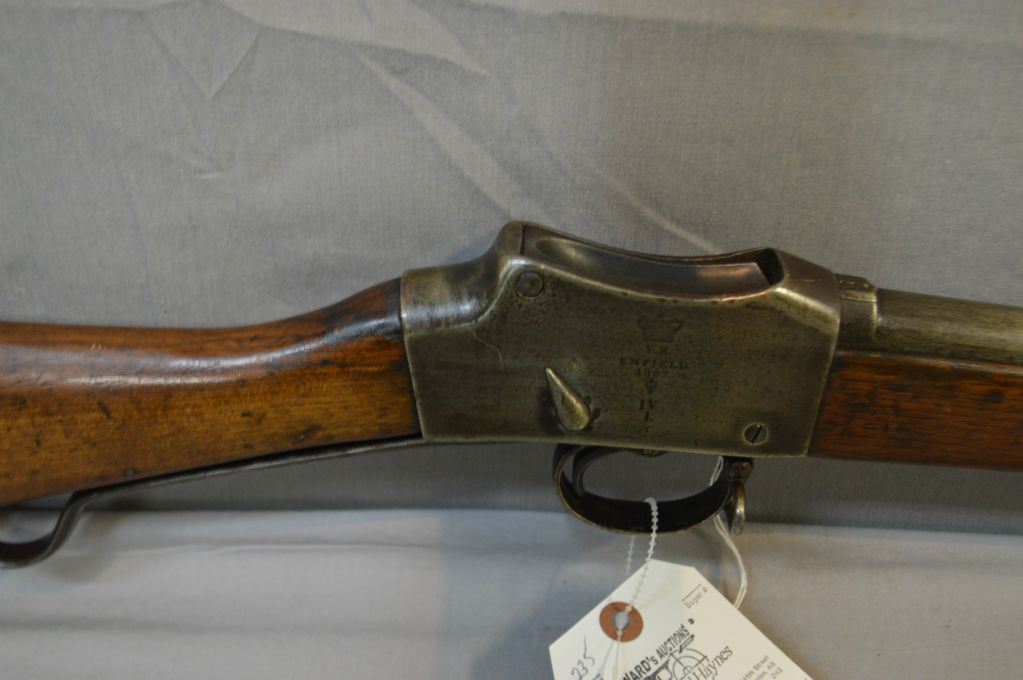 Martini Enfield Model 1887 No. IV Mark 1 - 2 .577 / 450 Cal Single Shot Martini Action Long Lever Two Band Rifle w/ 33 1/4 " bbl [ fading blue finish, laquered over top of wood & metal, butt stock has various numbers including 2322, etc., barrel stamped 170, under neath on frame by swivel stamped 1399, with two swivels & metal cleaning rod ] Ser # 1399 ANTIQUE NO PAL REQ