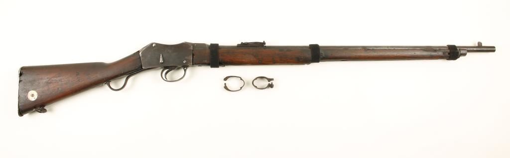 Blued single-shot slope-breech short lever British Military rifle 1884 Pattern III 1. Made in 1896 at Enfield Lock. Butt stock is stamped with Enfield cartouche, Broad Arrow proofs, "TLF" and number "1120". There is also a brass disc with "T.V. 23?" stamped on it. The butt is missing chips by the buttplate. 30" barrel has a dark bore with strong rifling that has some roughness. Action works well. Has small cocking indicator. Exterior of barrel has some major deep pitting. Rear ladder sight is bent. Receiver has good legible stampings. Forend is held on with Velcro strips but the barrel bands are in an accompanying bag. Forend has some rotted areas to it. No cleaning rod. Action works well. Condition is poor to fair. **Antique Firearm**
