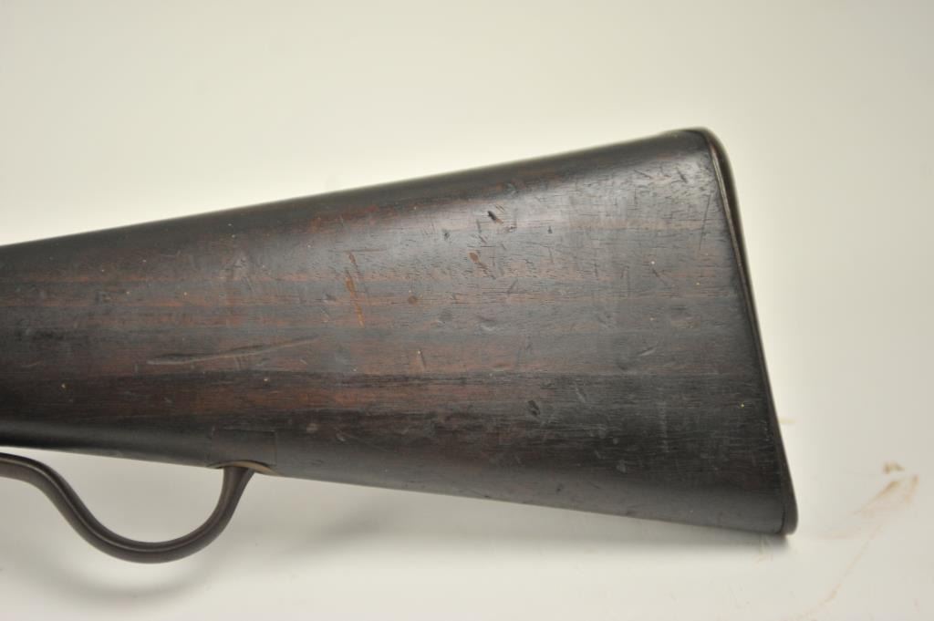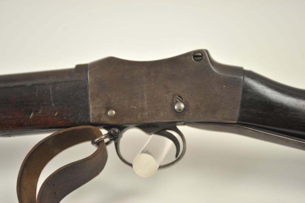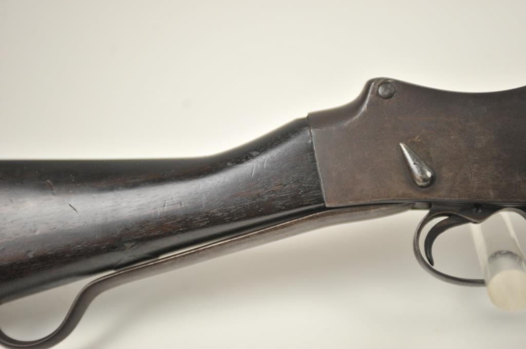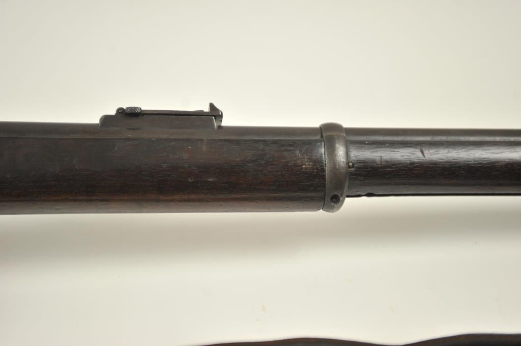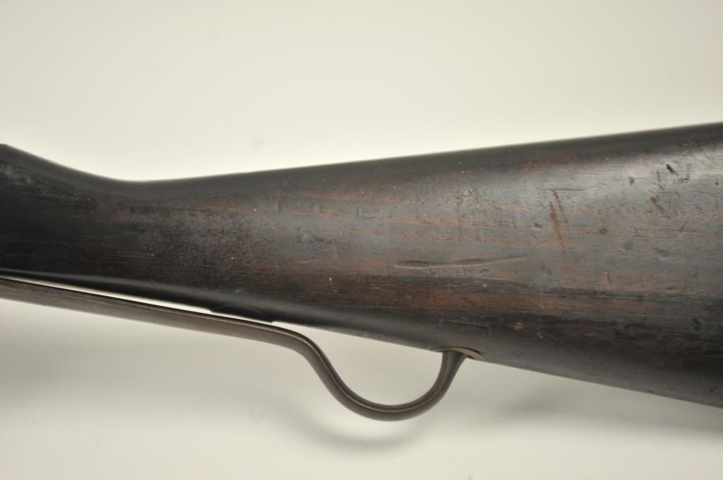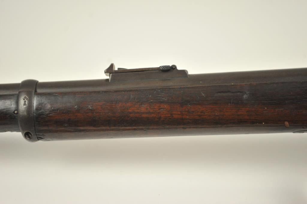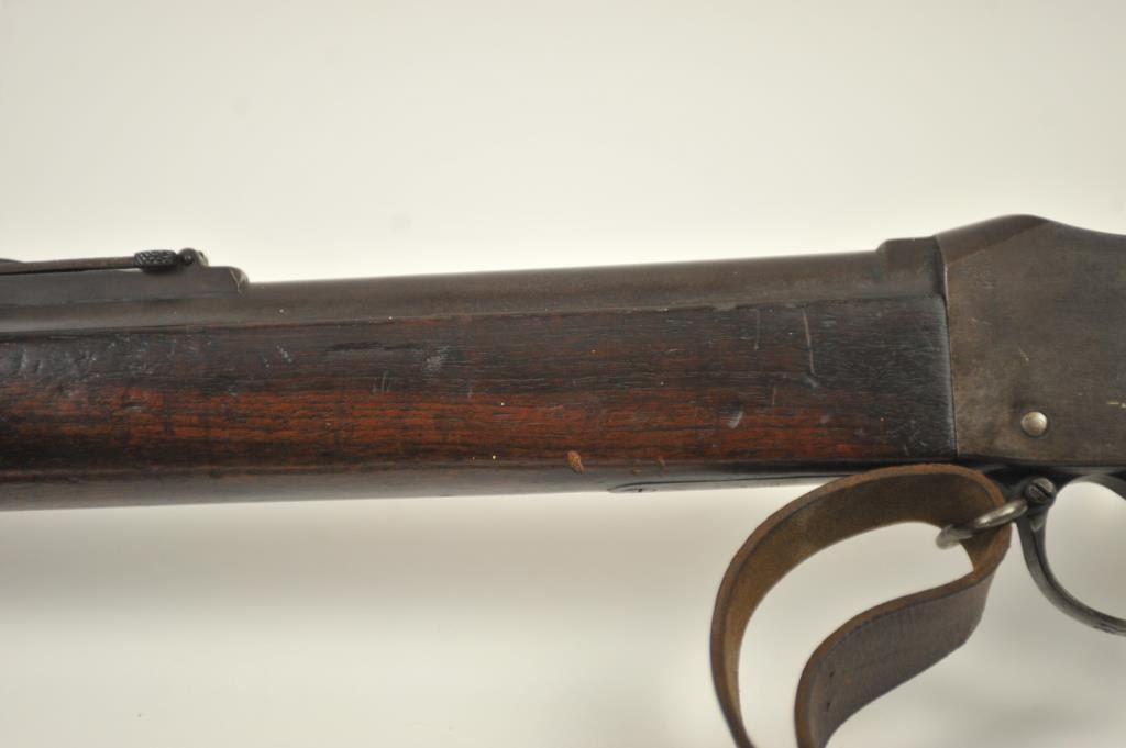 Martini-Henry British Issue falling block rifle in .577 caliber, showing a crown V.R. and 1887 with a broad head arrow proof and an IV over I on the right side of the frame, 1908 and ordnance wheel cartouche along withan Asian cartouche near the left heel of the butt plate. The rifle has a good action and good bore with strong rifling and some erosion between the grooves. The rod and sling included, the stock shows dents andimperfections and good plus overall with a 33 ½” barrel with a stud for bayonet. Est.: $600-$1,200. (Antique).