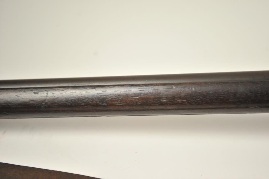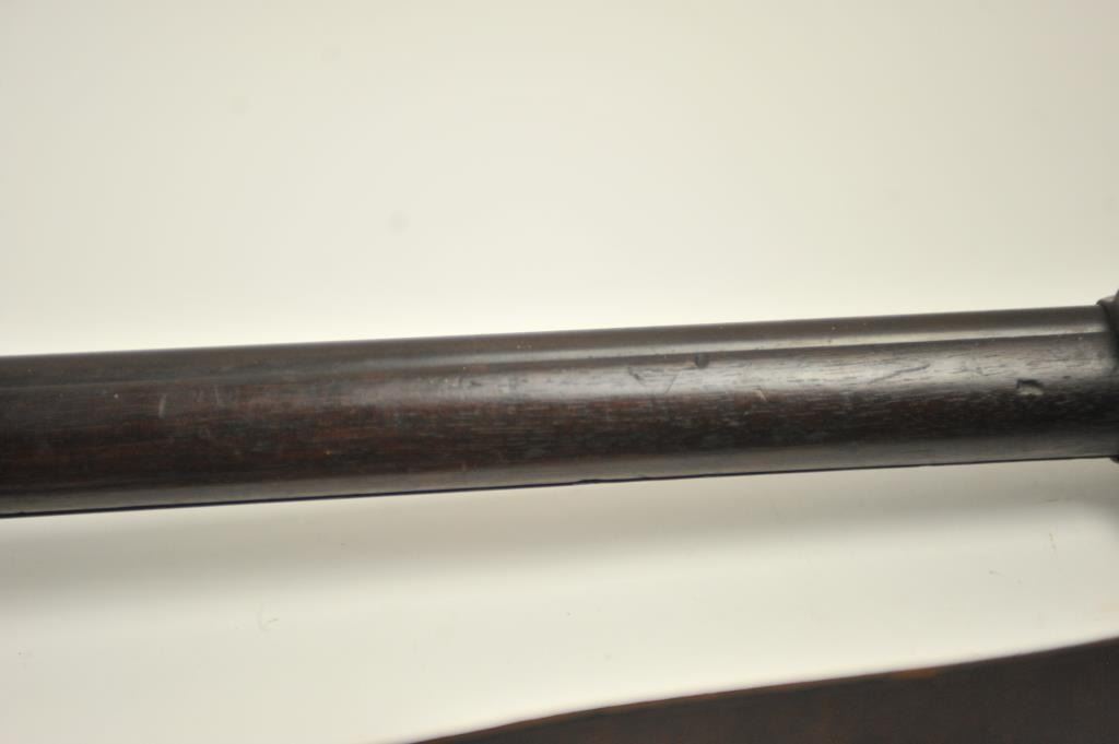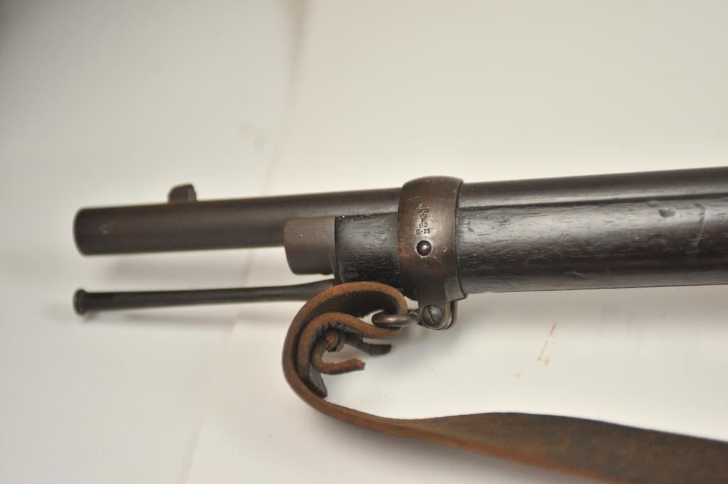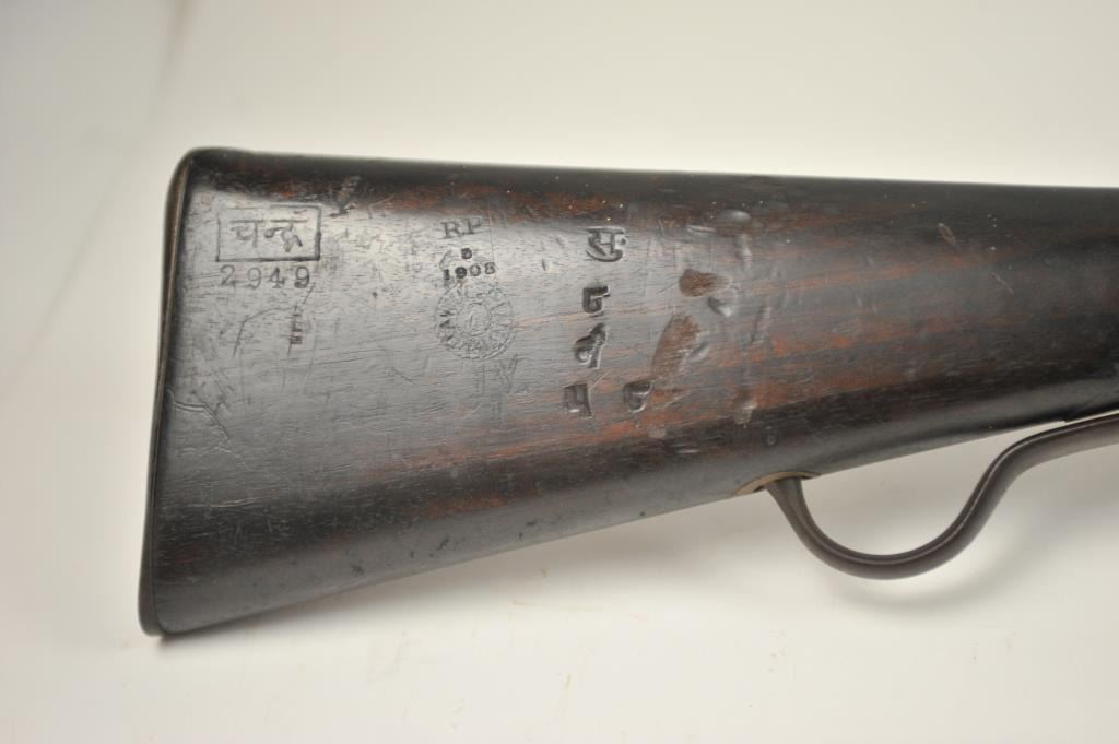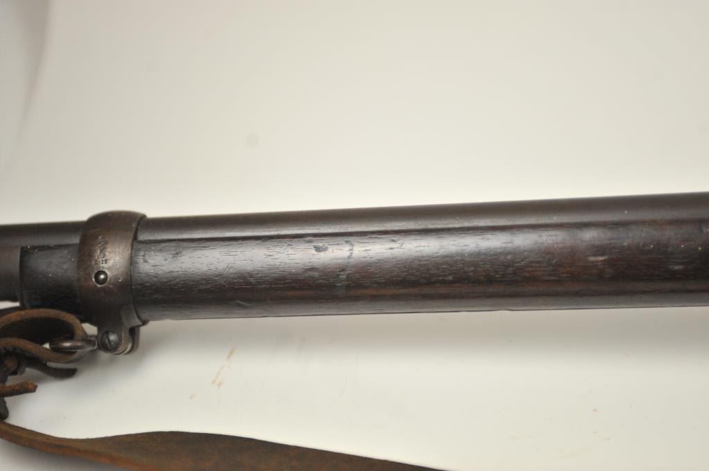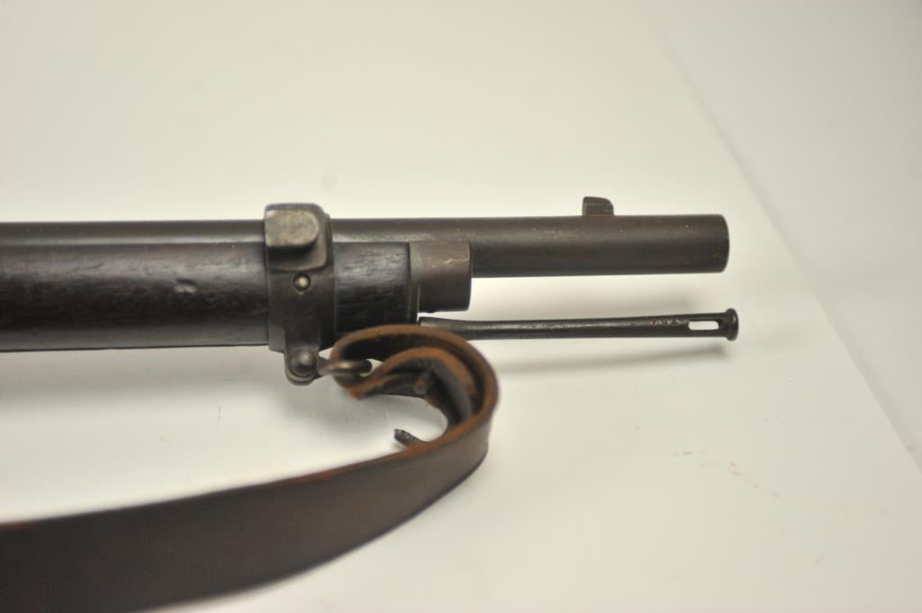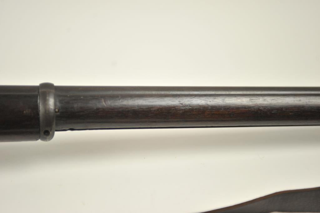 Martini-Henry British Issue falling block rifle in .577 caliber, showing a crown V.R. and 1887 with a broad head arrow proof and an IV over I on the right side of the frame, 1908 and ordnance wheel cartouche along withan Asian cartouche near the left heel of the butt plate. The rifle has a good action and good bore with strong rifling and some erosion between the grooves. The rod and sling included, the stock shows dents andimperfections and good plus overall with a 33 ½” barrel with a stud for bayonet. Est.: $600-$1,200. (Antique).