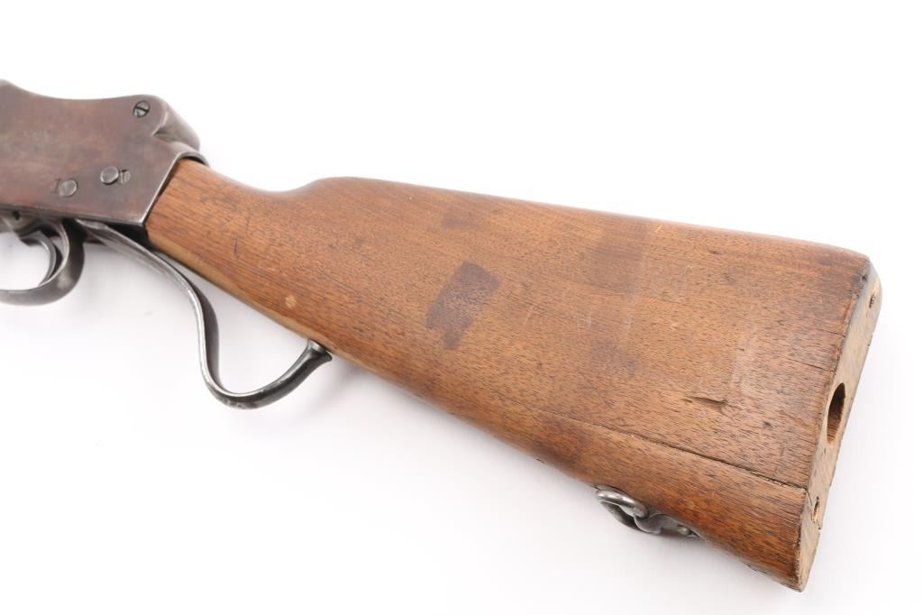 This is a Martini-Henry action rebarreled with a Winchester 32-40, 1/3 octagon, round barrel. 29", two line Winchester markings on top flat, caliber marked on bottom flat. Bore is very good/bright with some minor areas of very light pitting. No sights, empty dovetails. Has turned a gray/brown patina, with blue on the lower underside. No forearm. Action is unmarked, except for "E.G." on the triggerguard. The left side is stamped -CAPT.-, the right side is stamped -C.PATT- over "AIMAWIS-(?). Buttstock is poor, cracked, not original, no buttplate, Falling block action works well. NRA Condition-Fair-Needs restoration. Antique Firearm.