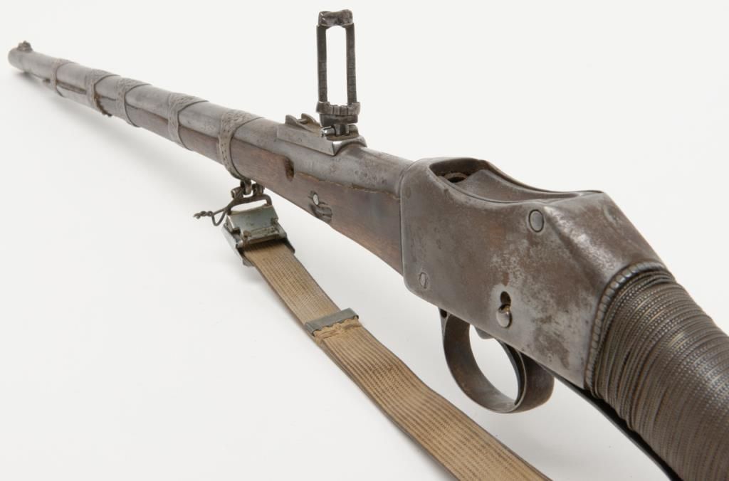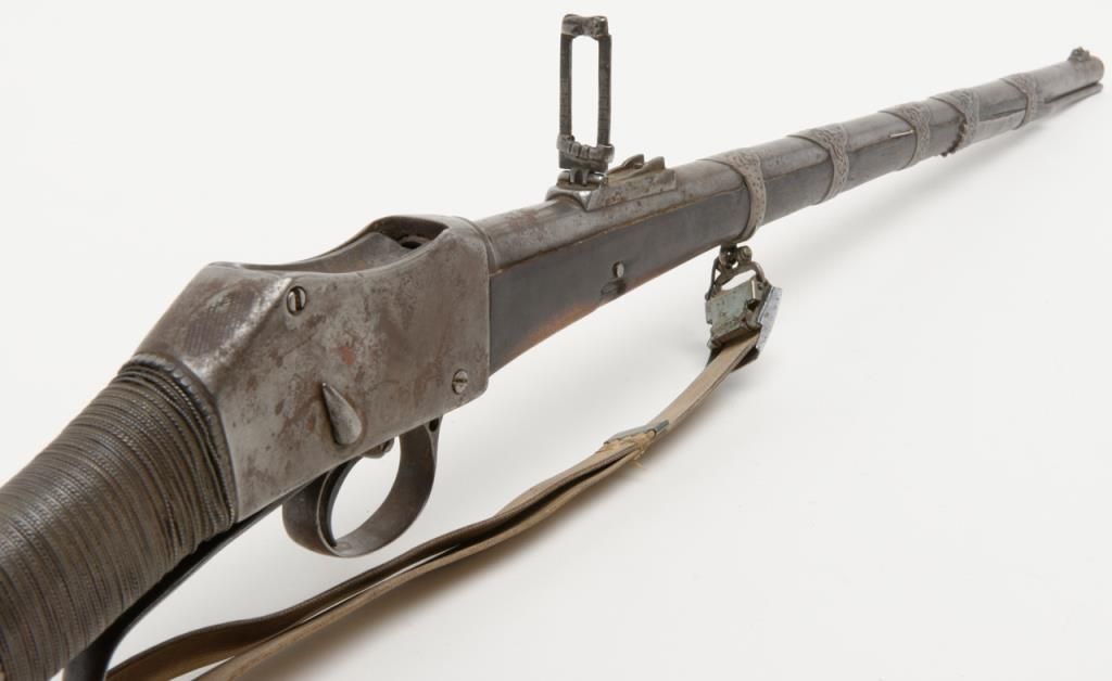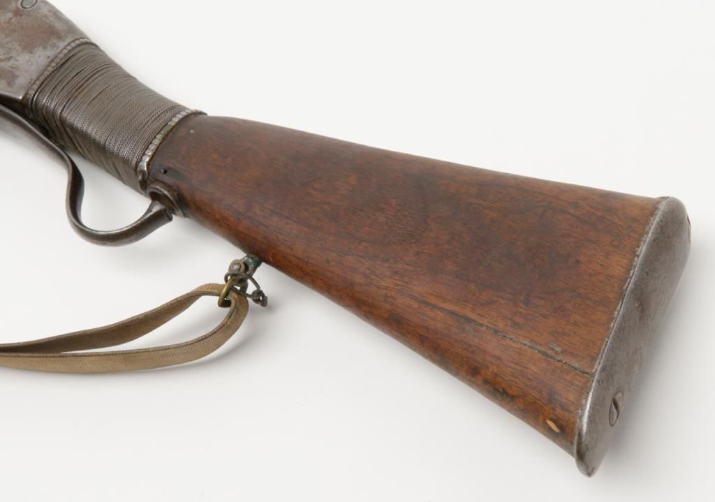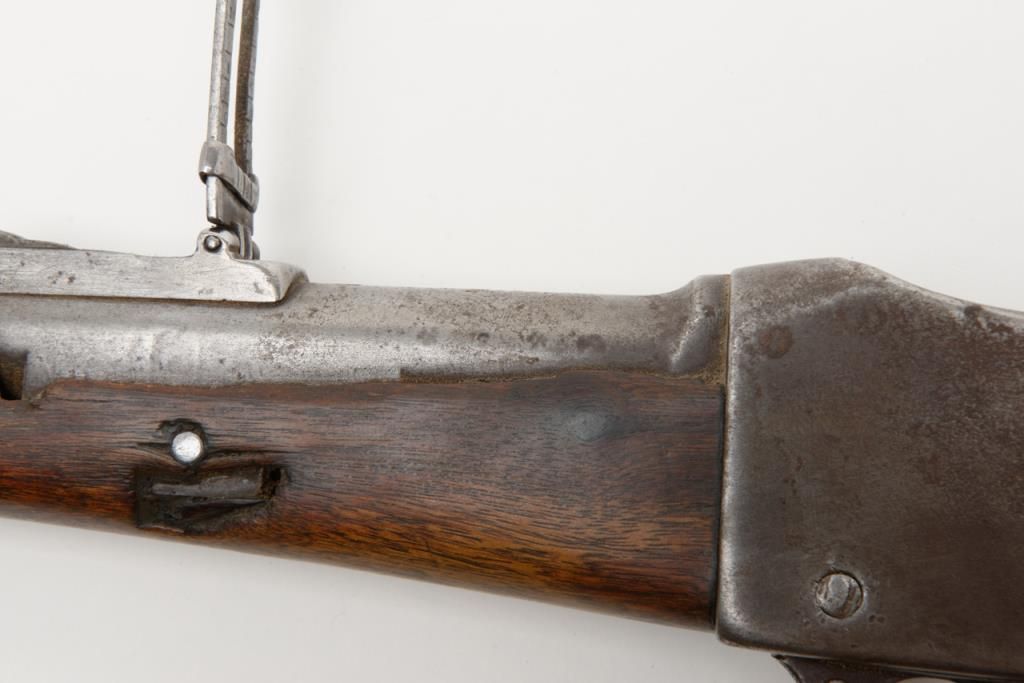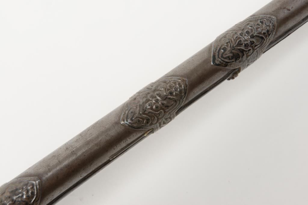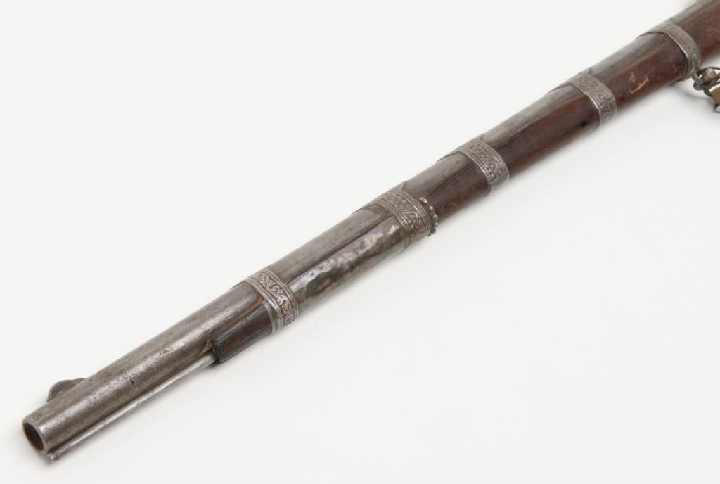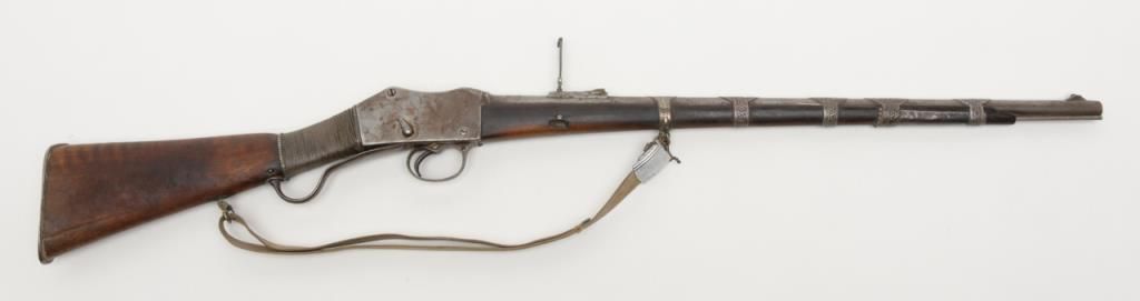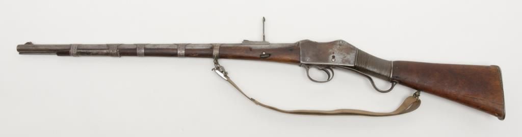 Martini Henry period copy handmade in the Middle East showing high quality silver bands with niello decoration and silver wire wrap at wrist. Consignor information states that “This carbine was found in Yemen”. The gun measures approximately and 41” overall with 25” barrel of approximately .52 caliber. The metal surfaces show a gray patina with some minor rust and erosion. The stocks are fair to good with some losses, wear to the wood and normal aging. The action works very well and the bore is rough. The quality is good other than the sight which is somewhat crude. Est.: $150-$300