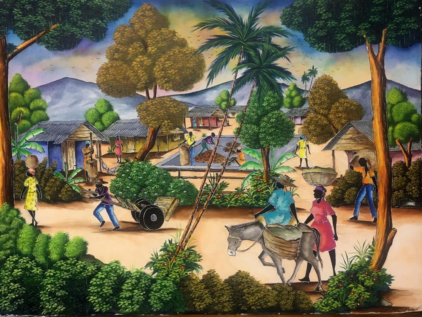 "Coffee Plantation" is an original pen and ink and watercolor by renowned Haitian artist Martino Dorce. Unframed it is 22.5x30.25" on arches paper.