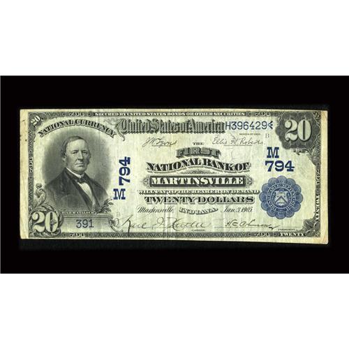 <B>Martinsville, IN</B></I> - $20 1902 Date Back Fr. 642 <B>The First NB</B></I> Ch. # (M)794<BR>A nice pen signed Date Back, one of only two examples of this type recorded to date from here. <B>Very Fine.</B></I><BR><BR><b>Shipping:</b> Coin/Currency (<a target="_blank" href="http://www.heritageauctions.com/common/shipping.php">view shipping information</a>)