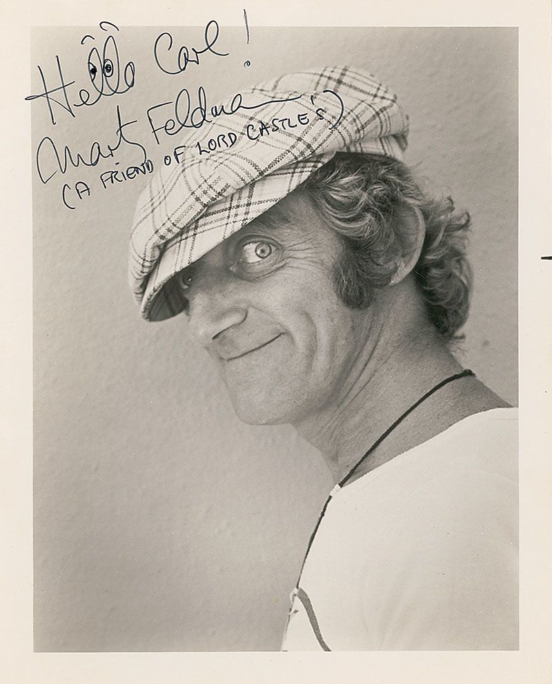 Glossy 8 x 10 photo of Feldman peering out from under his scally cap, signed and inscribed in black felt tip, “Hello Carl! Marty Feldman (a friend of Lord Castle’s),” with Feldman drawing two eyes inside the “ll” of “Hello.” Some scattered creases and surface marks, otherwise fine condition.