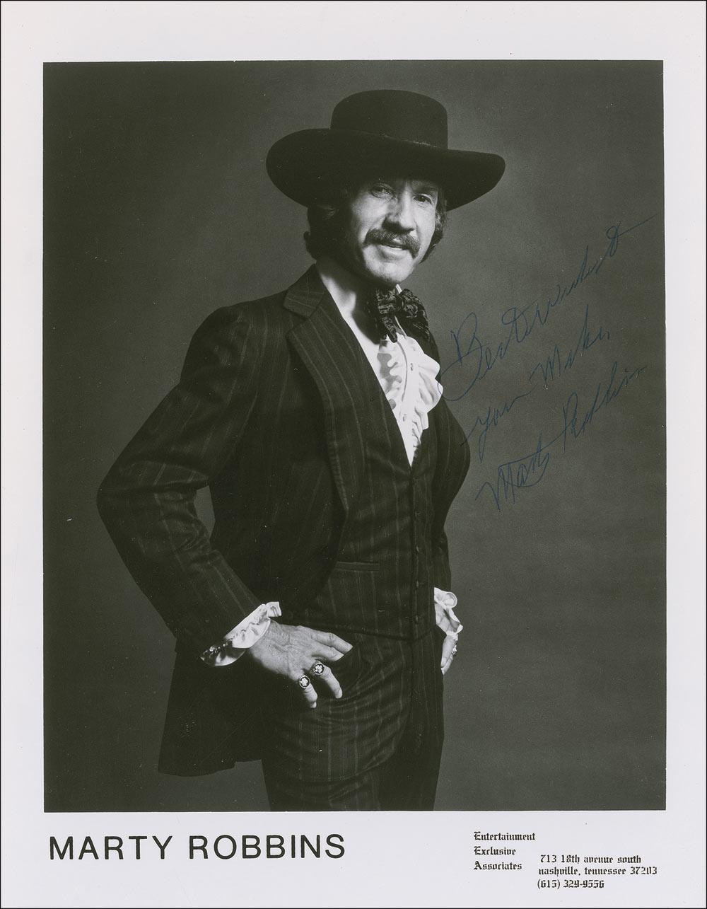 Glossy 8 x 10 publicity photo, signed and inscribed in blue ballpoint “Best wishes to you Mike, Marty Robbins.” In fine condition, with scattered creases and surface marks, a few spots to emulsion, and surface impressions from collector’s notations on reverse.