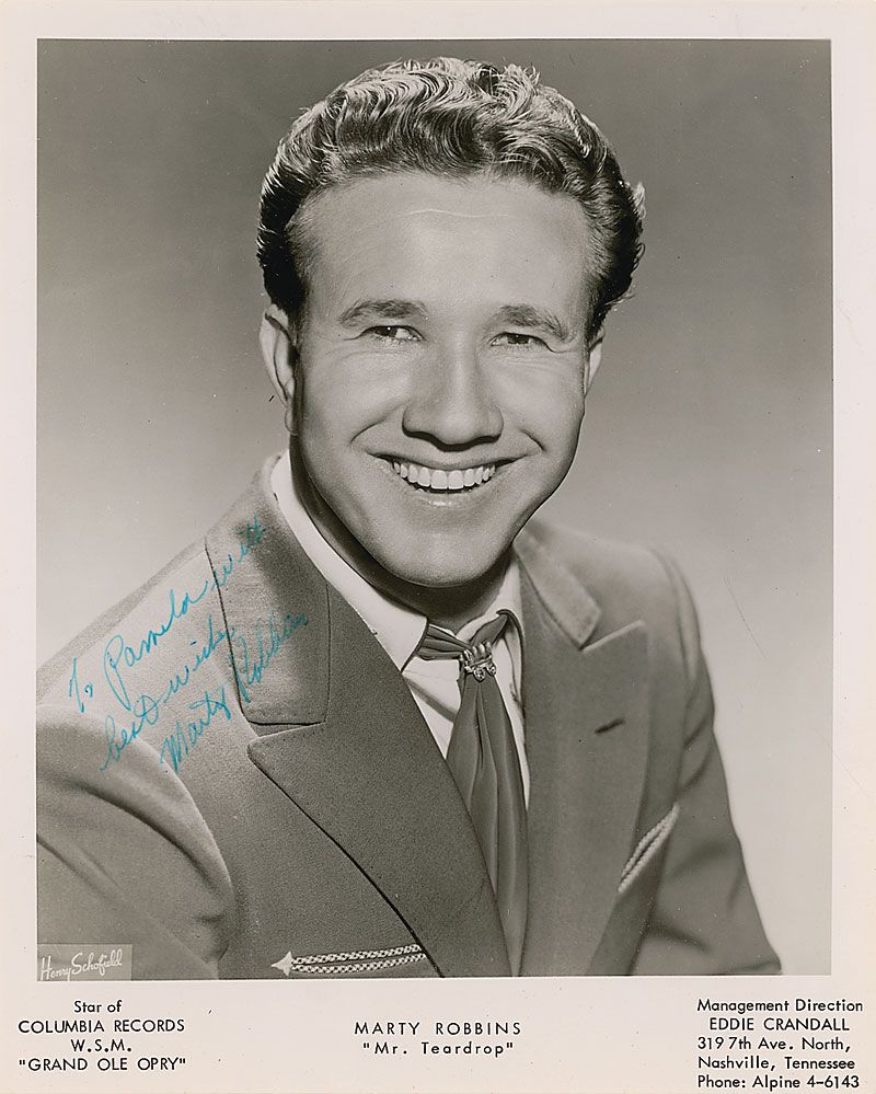Glossy 8 x 10 Columbia Records ‘Grand Ole Opry’ publicity photo, signed and inscribed in blue felt tip, “To Pamela, with best wishes, Marty Robbins.” In fine condition, with a few slight surface bends and creases.
