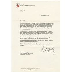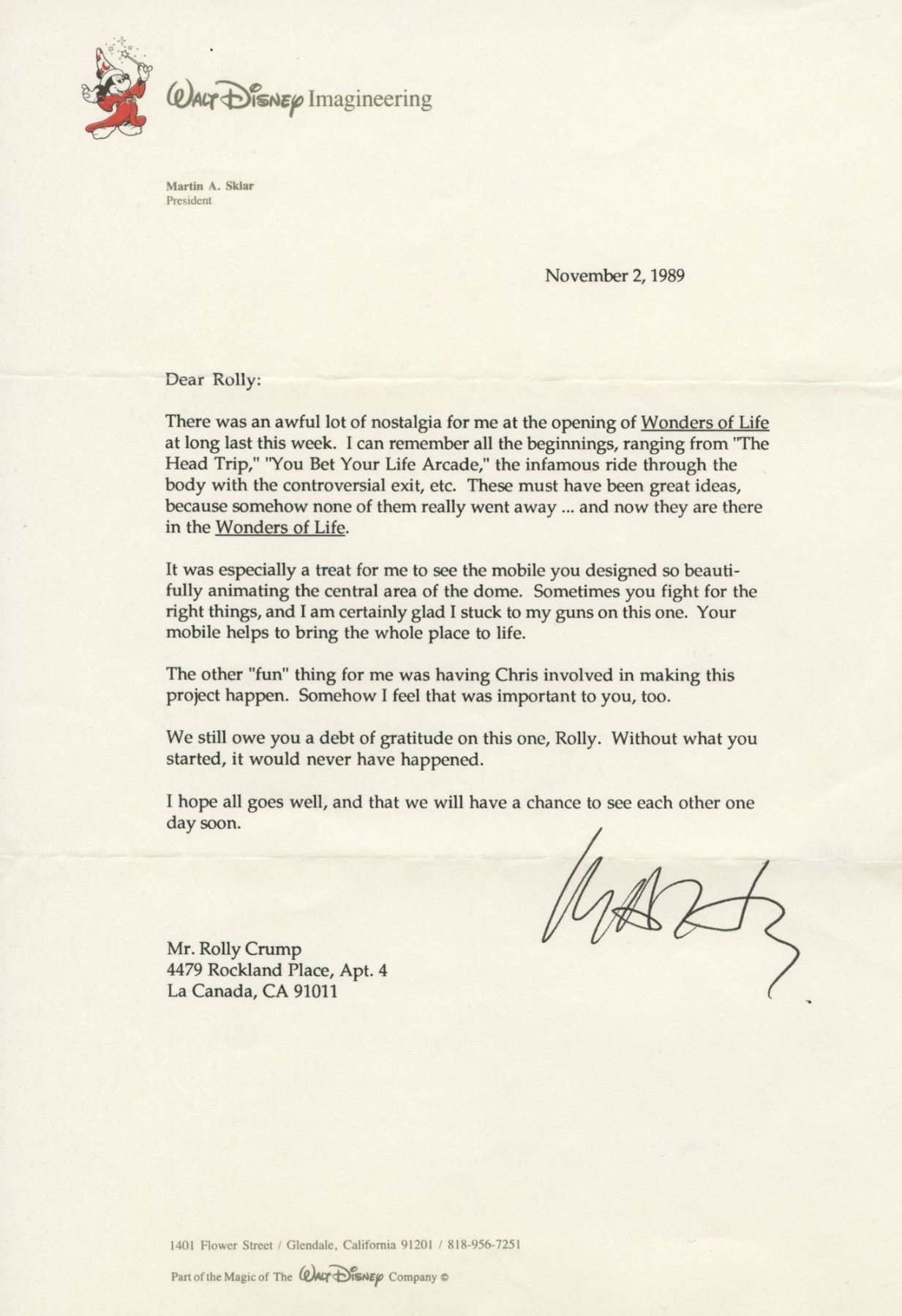 (EPCOT, 1989) A thank you letter sent from Marty Sklar to Rolly Crump regarding Rolly's role in "Wonders of Life" at EPCOT. The letter is on Walt Disney Imagineering stationery and was written on November 2, 1992, shortly after the opening of "Wonders of Life". The letter is signed in ink by Sklar, and measures 10.5"x7.25". The condition is very good with minor wear.