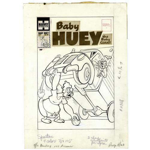 <B>Marty Taras (attributed) - Baby Huey, the Giant Baby #20 Cover Original Art (Harvey, 1959).</B></I> What do you get when you combine a half ton baby duck, a delivery truck, and a runaway ball? This wacky cover illustration, of course! The art has an image area of 7.25" x 10.5", and includes the original masthead and logo photostat paste-ups. There is some overall aging (especially at the top around the logo art); otherwise the condition is Very Good.