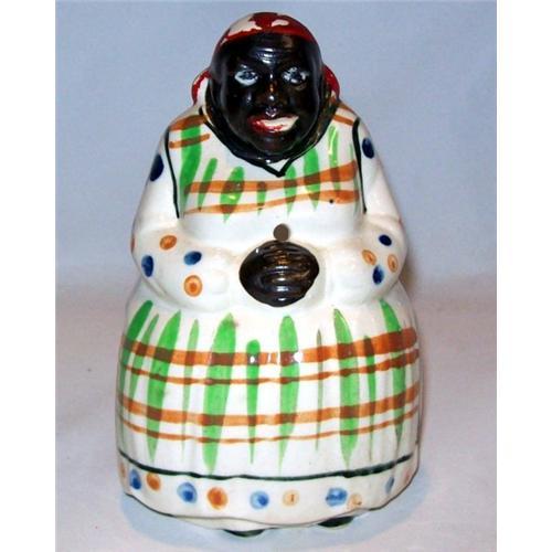This black Mammy string holder was made by Maruhon Ware in post war Japan. She is wearing a cheerful plaid bib apron over a polka-dot dress. Her hair is tied up with a red kerchief. This string holder has no chips or cracks. There is some crazing and the cold paint on the kerchief has some blank spots.