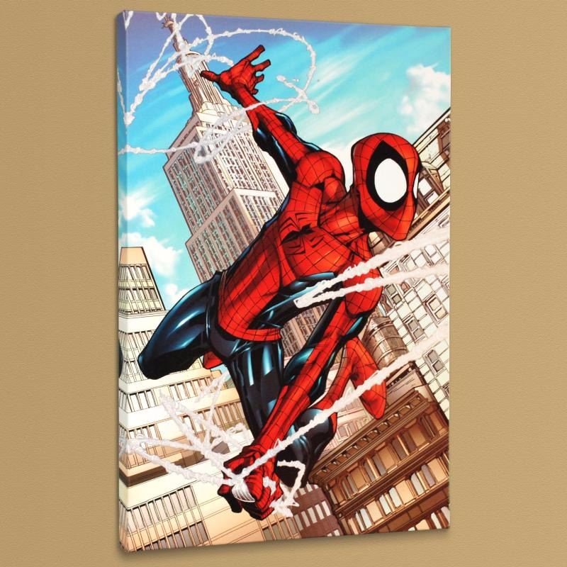A piece of comic book history, this limited edition, from original art by Patrick Scherberger, depicts a heroic Spider-Man. Patrick Scherberger is an American comic book penciller, known for his work on the book Marvel Adventures: Spider-Man. Scherberger's career began when he entered and won an internet competition called "Comic Book Idol" in 2004. During the competition he was contacted by Joe Quesada to do a formal try-out for Marvel Comics and, as a result of this, was soon chosen to pencil Marvel Adventures: Spider-Man. "Marvel Adventures: Spider-Man #50" is a limited edition numbered giclee on canvas by Patrick Scherberger presented by Marvel Comics. This piece comes gallery wrapped and ready to hang. Includes Certificate of Authenticity! Measures approx. 18" x 27" (image). Retail Price $500.00. PRICE INCUDES FREE SHIPPING IN THE U.S. - SHIPPING WILL BE ADDED TO YOUR INVOICE FOR ALL BUYERS OUTSIDE OF THE U.S.
