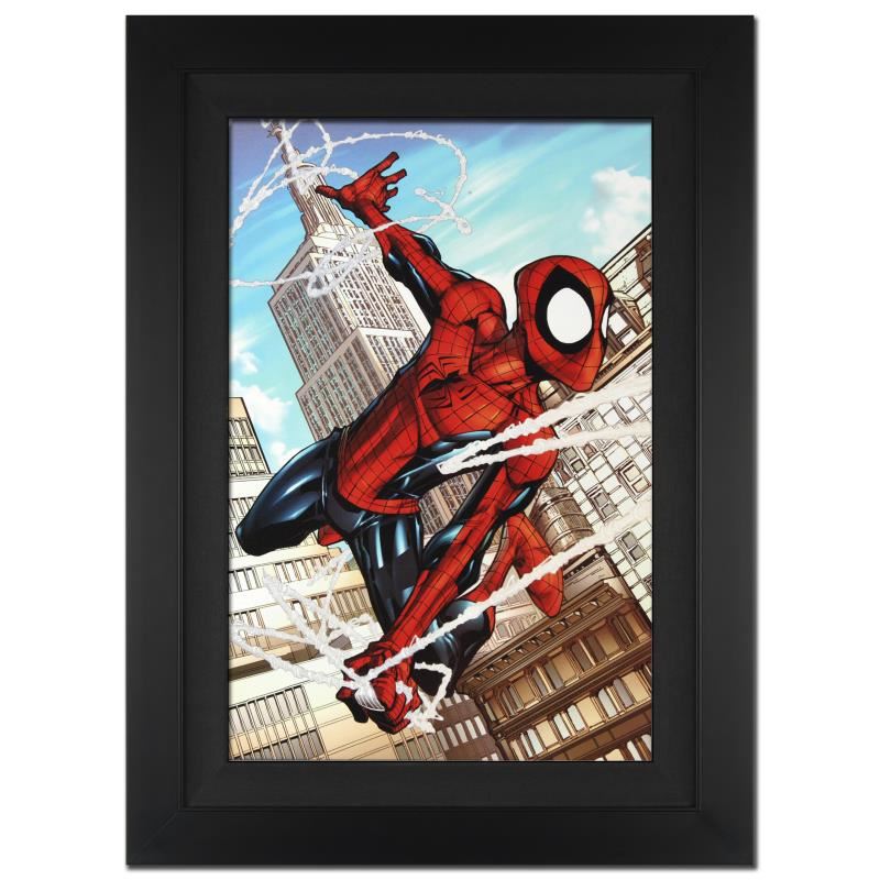 A piece of comic book history, this limited edition, from original art by Patrick Scherberger, depicts a heroic Spider-Man. Patrick Scherberger is an American comic book penciller, known for his work on the book Marvel Adventures: Spider-Man. Scherberger's career began when he entered and won an internet competition called "Comic Book Idol" in 2004. During the competition he was contacted by Joe Quesada to do a formal try-out for Marvel Comics and, as a result of this, was soon chosen to pencil Marvel Adventures: Spider-Man. "Marvel Adventures: Spider-Man #50" is an extremely limited edition giclee on canvas by Patrick Scherberger presented by Marvel Comics, hand signed by the Great Stan Lee (1922-2018) and numbered out of only 10! This piece is custom framed and ready to hang. Includes Certificate of Authenticity! Measure approx. 25" x 34" (with frame), 18" x 27" (image).