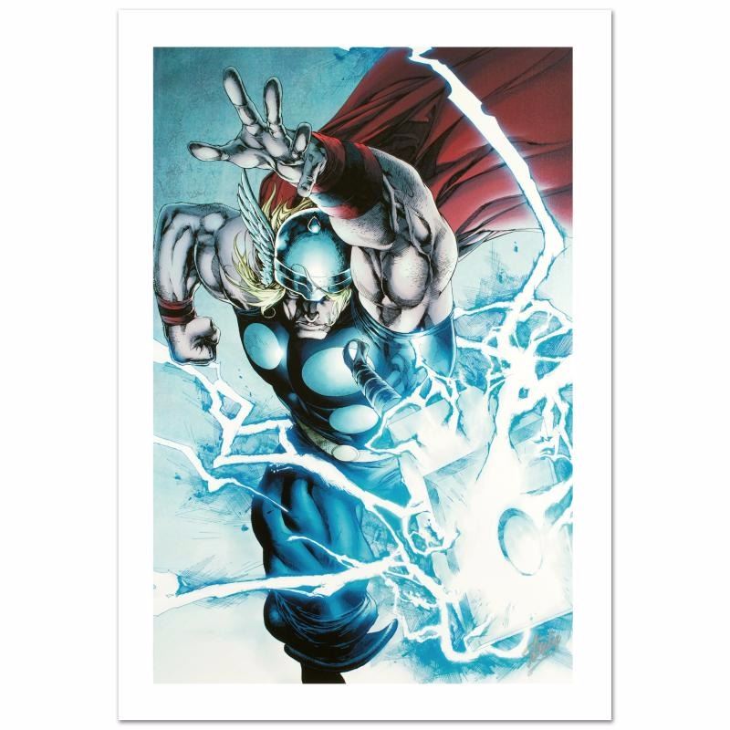 A piece of comic book history, this limited edition, from original art by Stephen Segovia, depicts a heroic Thor. Stephen Segovia is a comic book artist, illustrator, graphic and concept designs artist, specializing in comic book illustrations. He is currently working on Wolverine Origins for Marvel Comics, Hired Assassins, and A Gun Runner. He has also worked on such titles as Silver Surfer, Mighty Avengers, and Amazing Spider-Man. "Marvel Adventures Super Heroes #19" is a limited edition giclee on canvas by Stephen Segovia presented by Marvel Comics, numbered and hand signed by the great Stan Lee! Includes Certificate of Authenticity! Measures approx. 18" x 27" (image). Retail Price $900.00. PRICE INCUDES FREE SHIPPING IN THE U.S. - SHIPPING WILL BE ADDED TO YOUR INVOICE FOR ALL BUYERS OUTSIDE OF THE U.S.